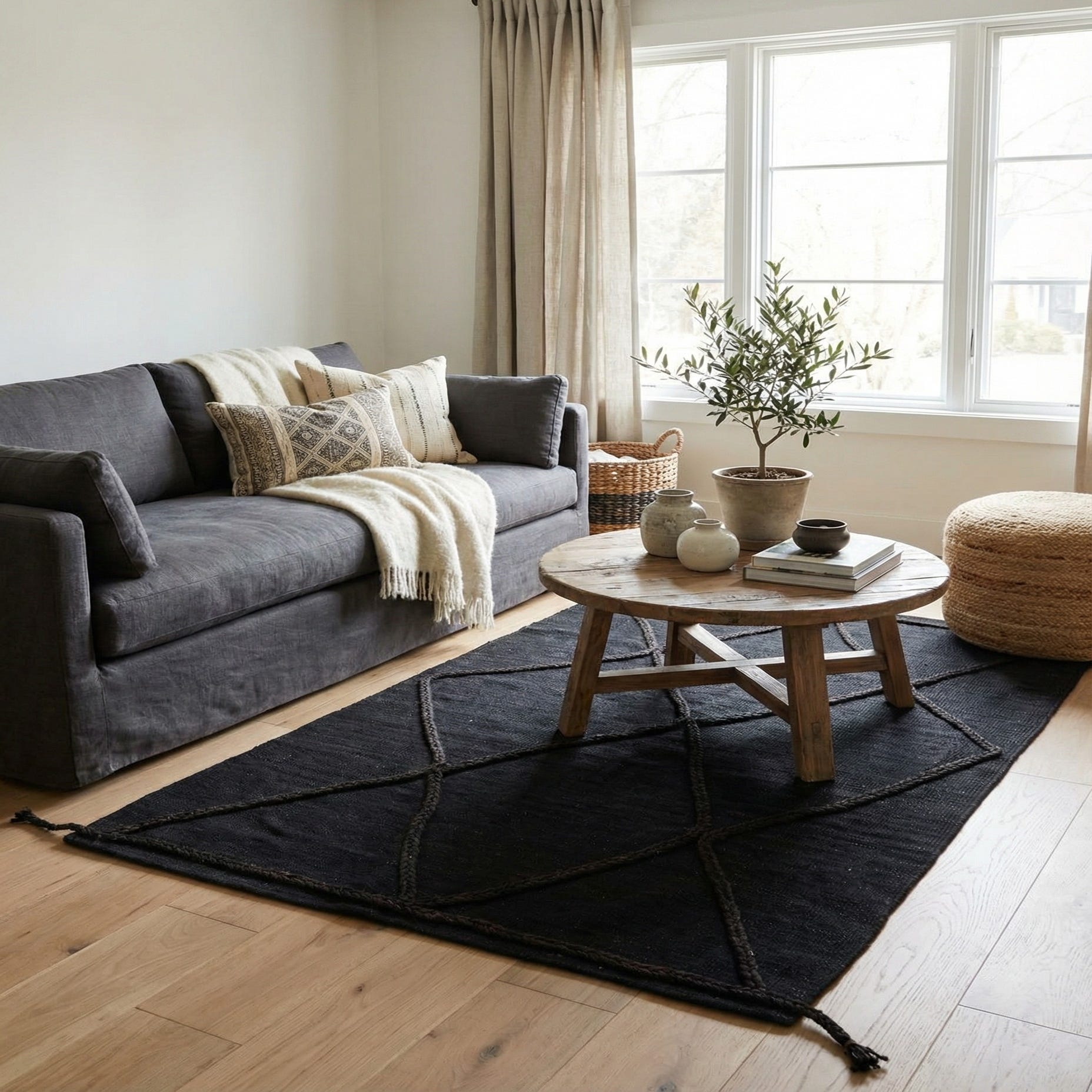 Primary color is Black. Colors in this rug include: Black, Brown.