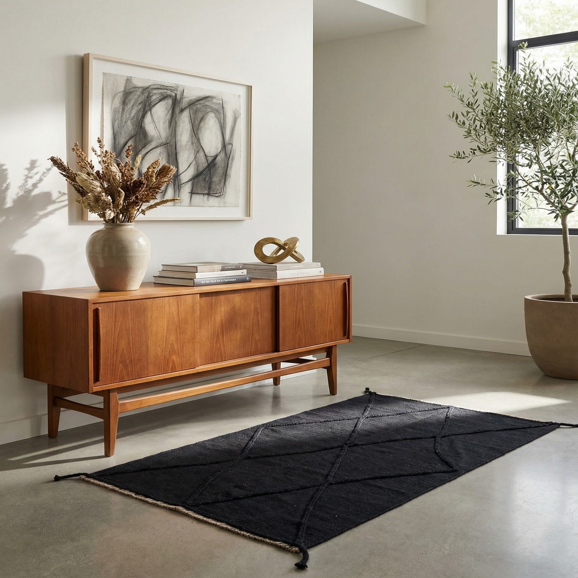 Primary color is Black. Colors in this rug include: Black, Beige.