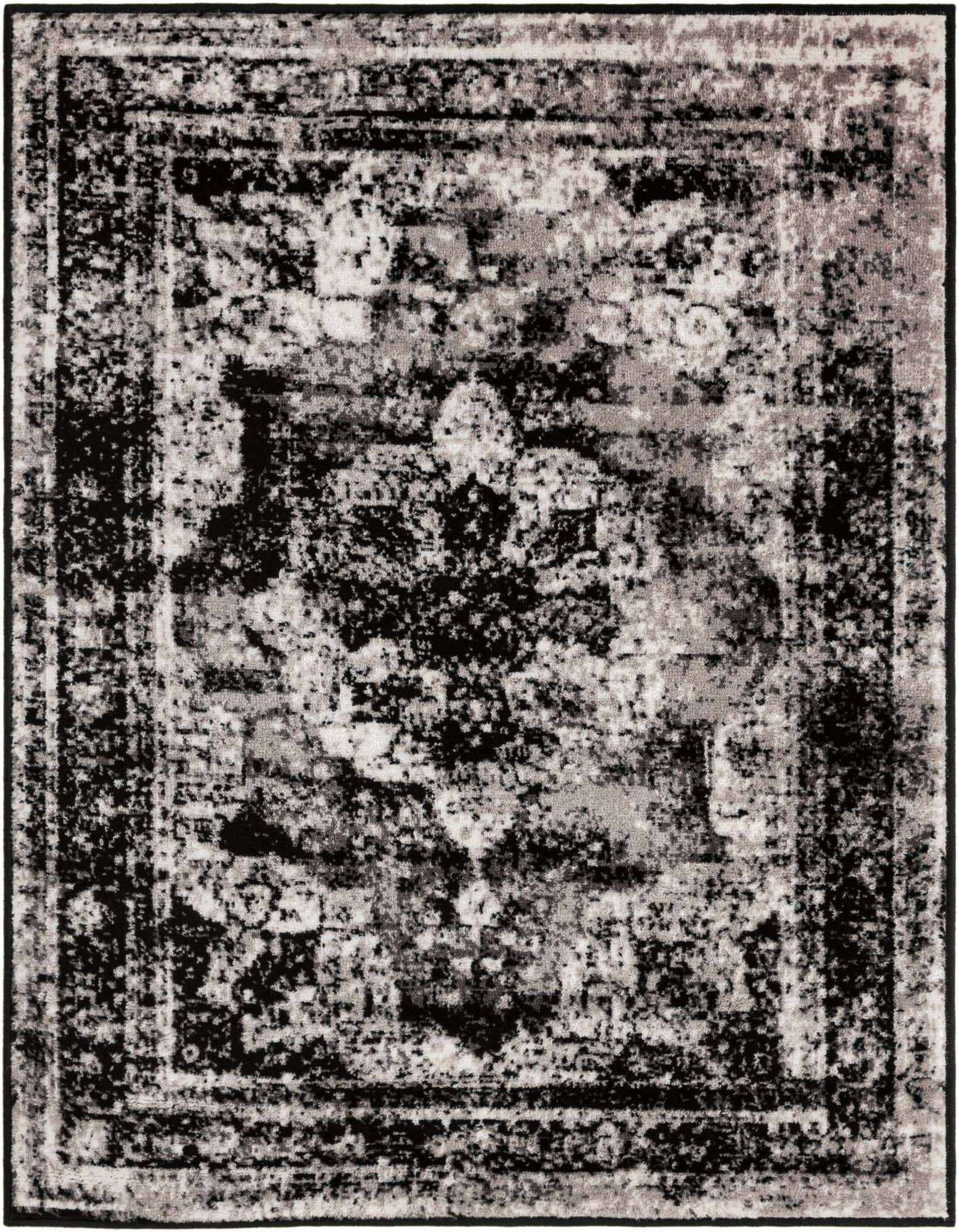 Primary color is Black. Colors in this rug include: Black, Gray, Ivory.