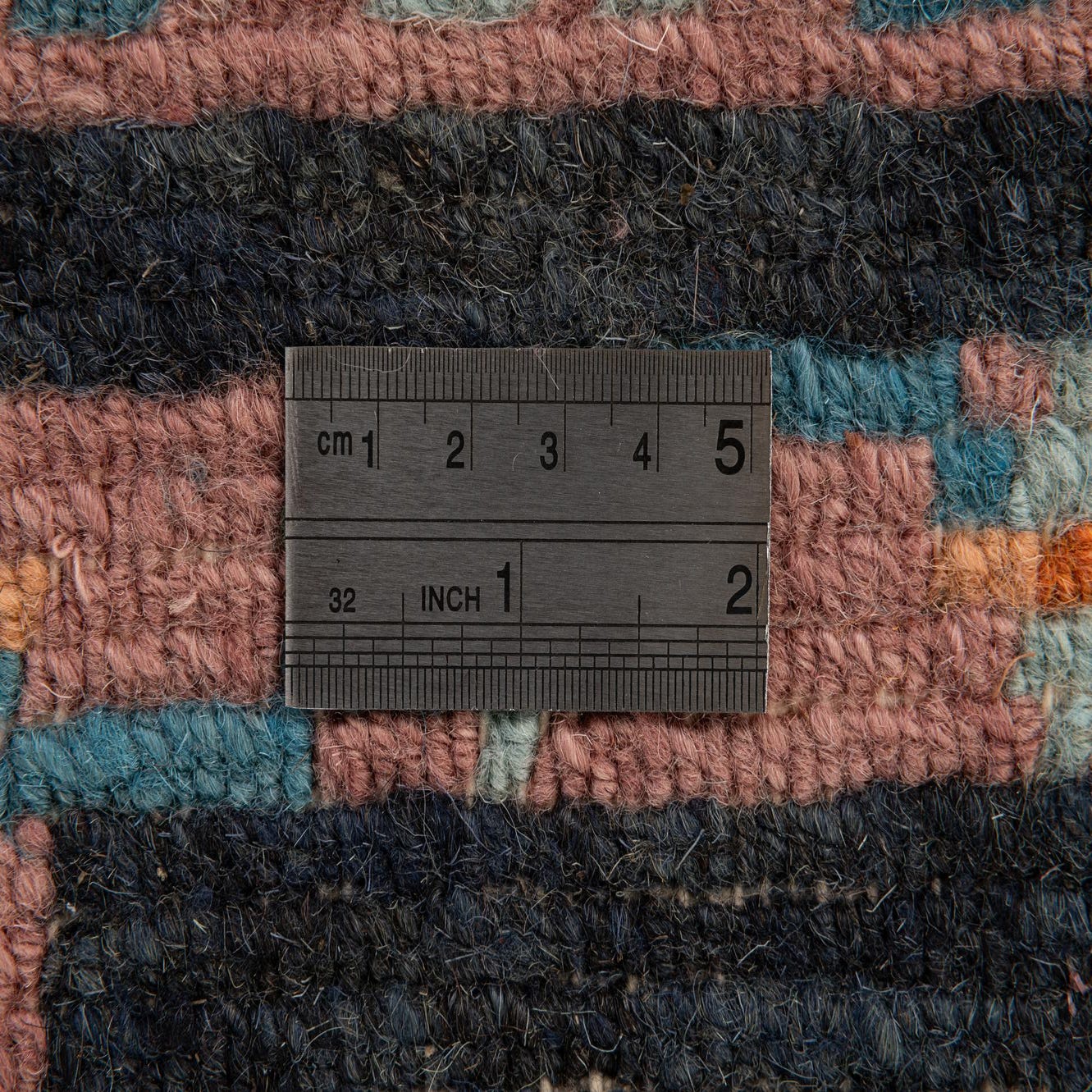 Primary color is Black. Colors in this rug include: Black, Blue, Green, Orange, Yellow.