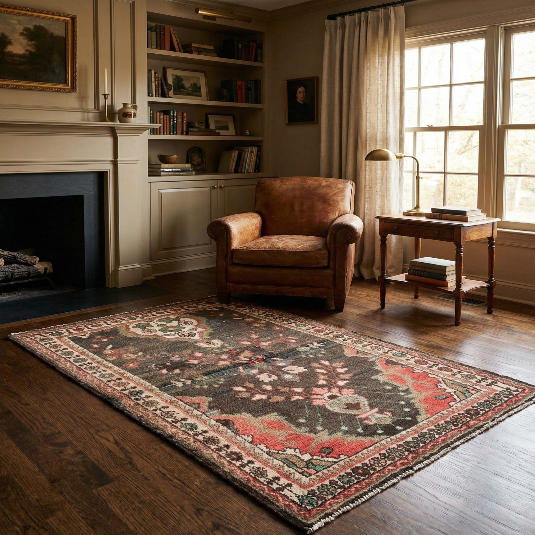 Primary color is Black. Colors in this rug include: Black, Brown, Green, Ivory, Red.