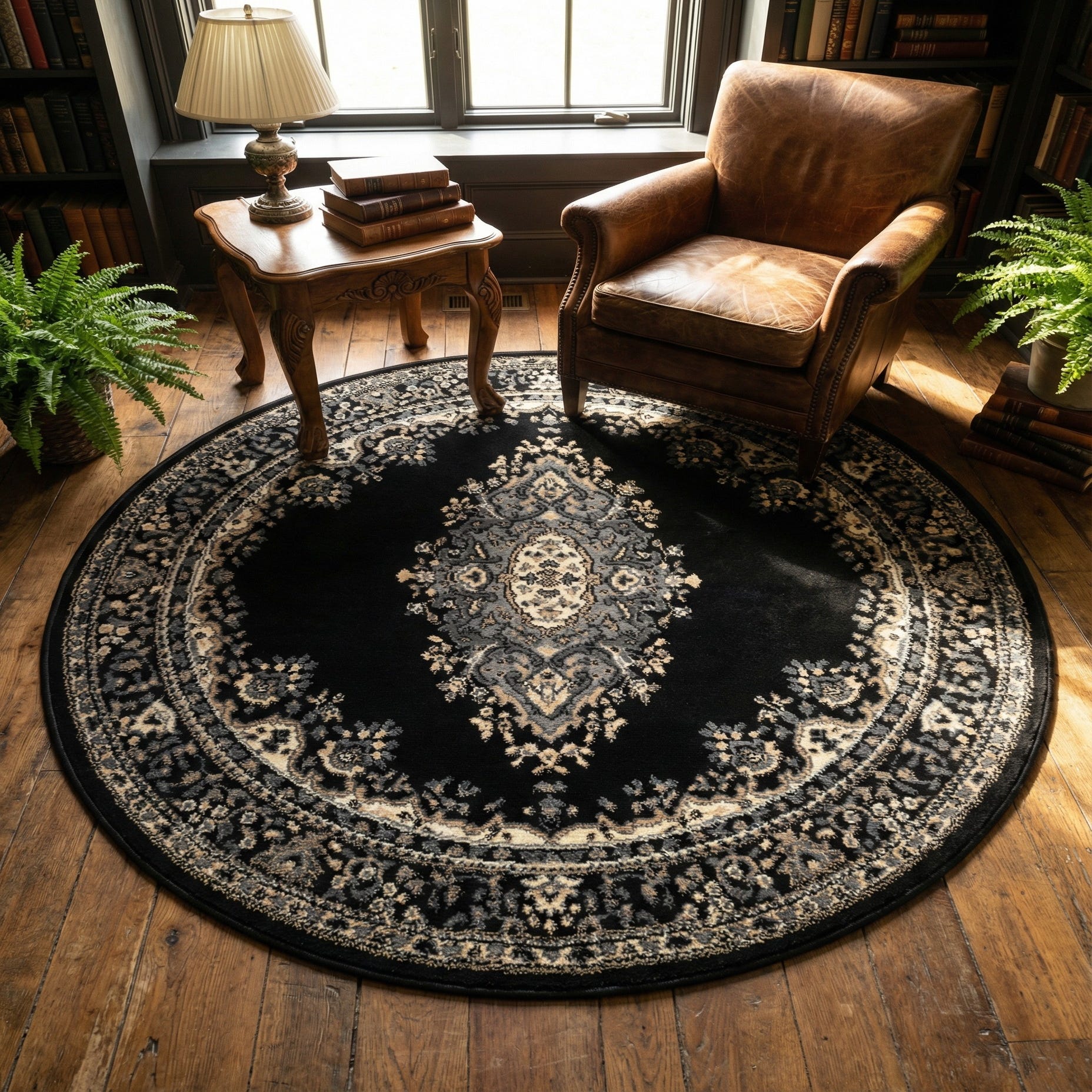Primary color is Black. Colors in this rug include: Black, Beige, Light Blue.