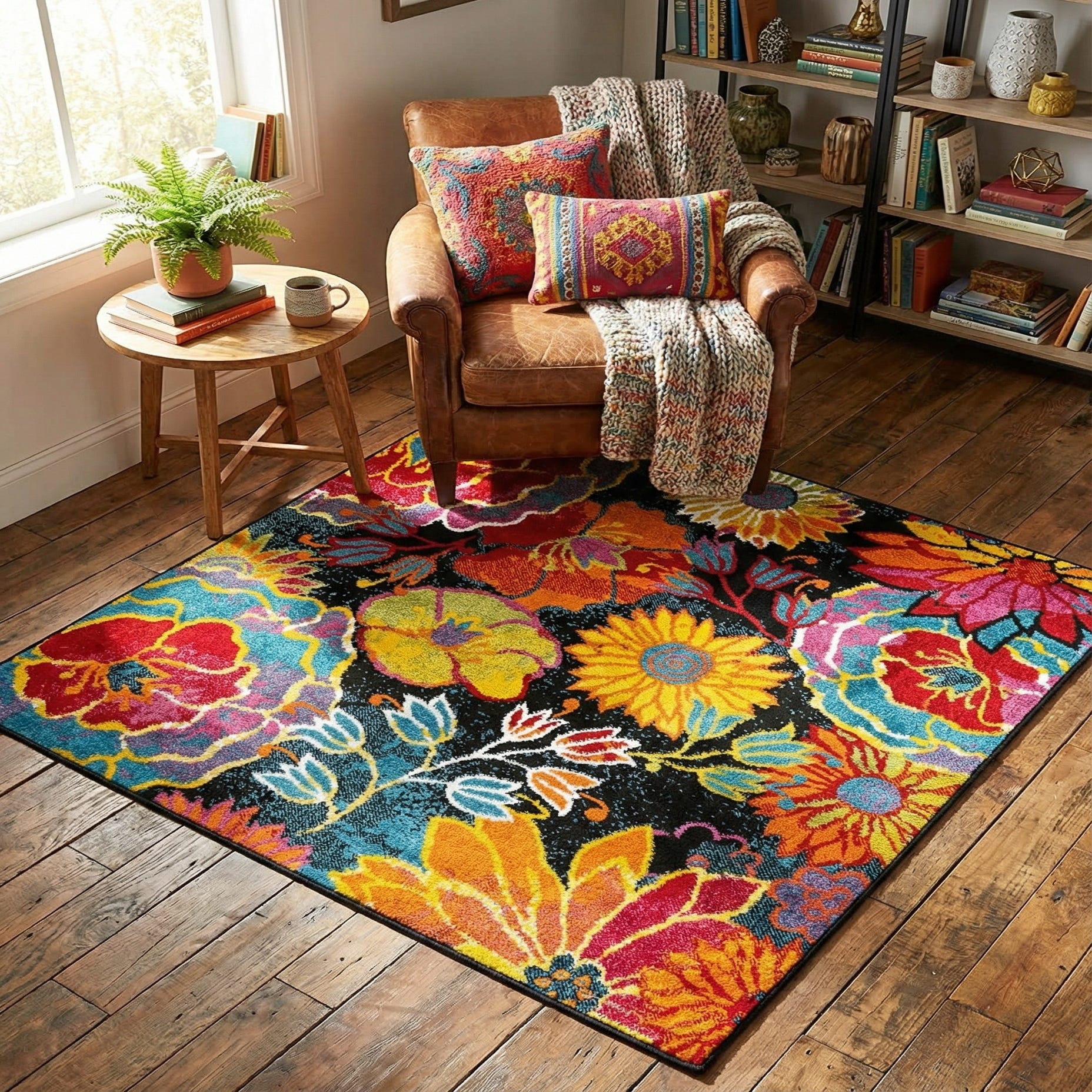 Primary color is Black. Colors in this rug include: Black, Green, Ivory, Orange, Red, Yellow, Blue.
