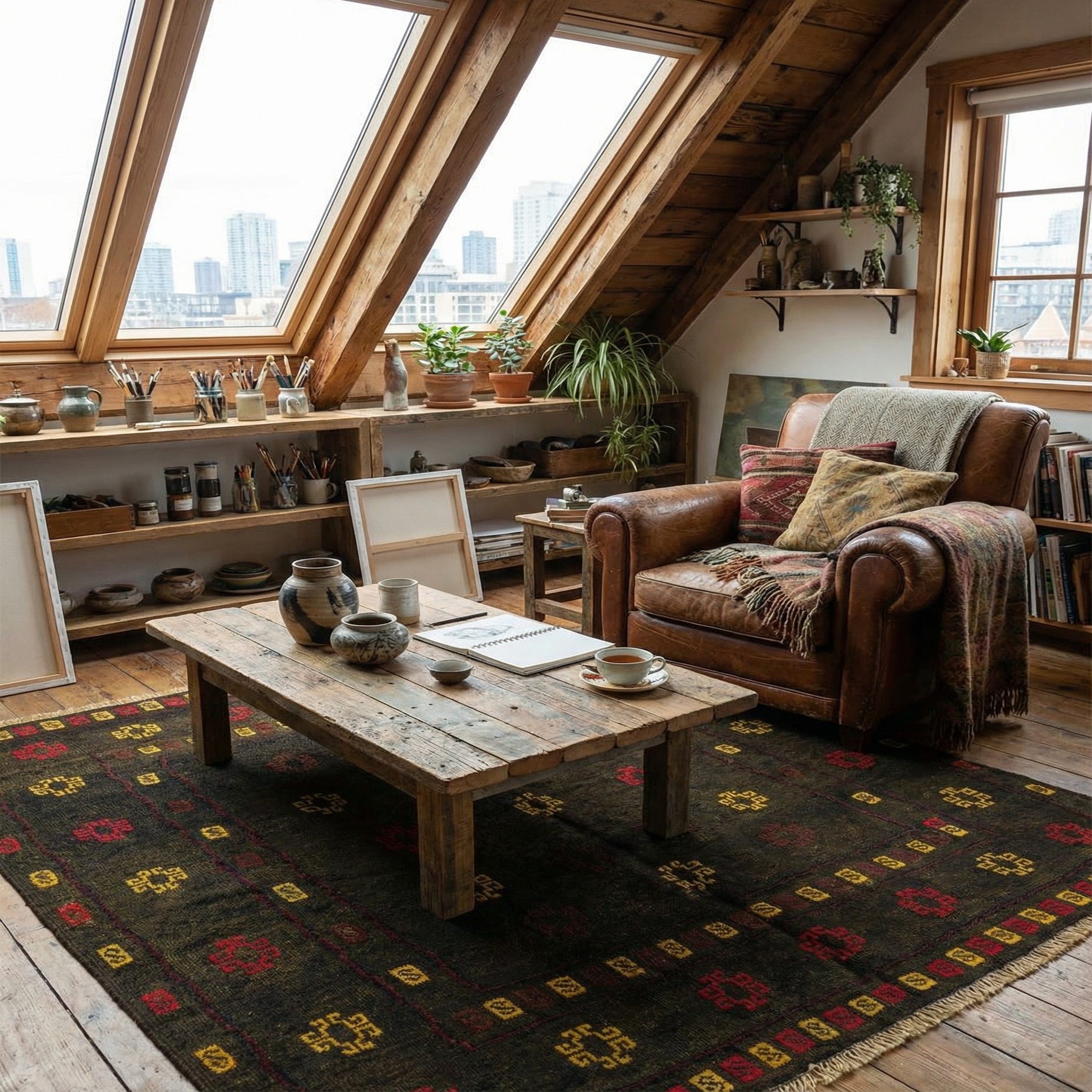 Primary color is Black. Colors in this rug include: Black, Burgundy, Cream, Red.