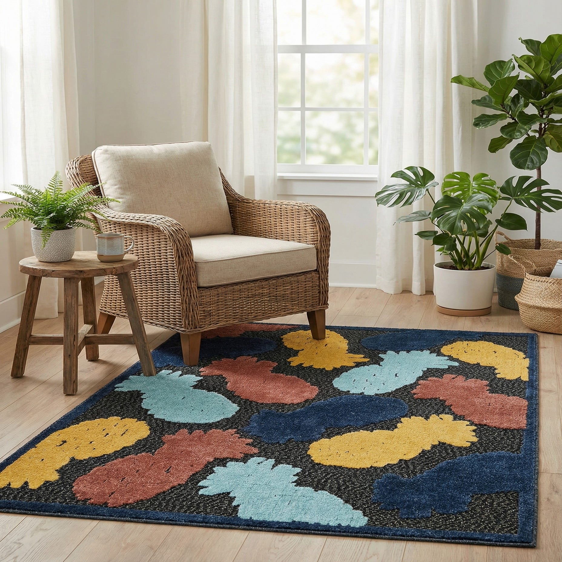 Primary color is Black. Colors in this rug include: Black, Light Blue, Navy Blue, Orange, Pink.