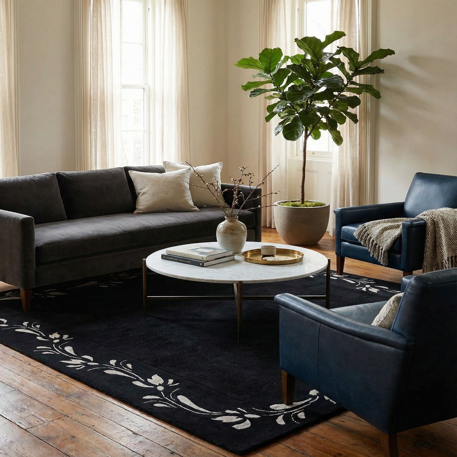 Primary color is Black. Colors in this rug include: Black, Gray, Silver.