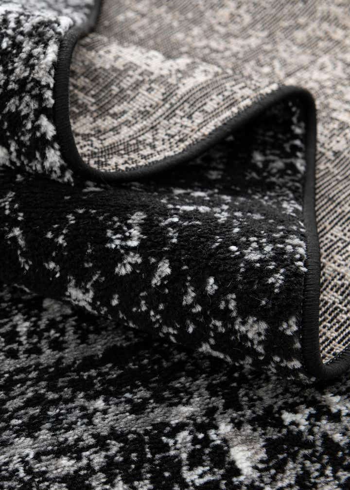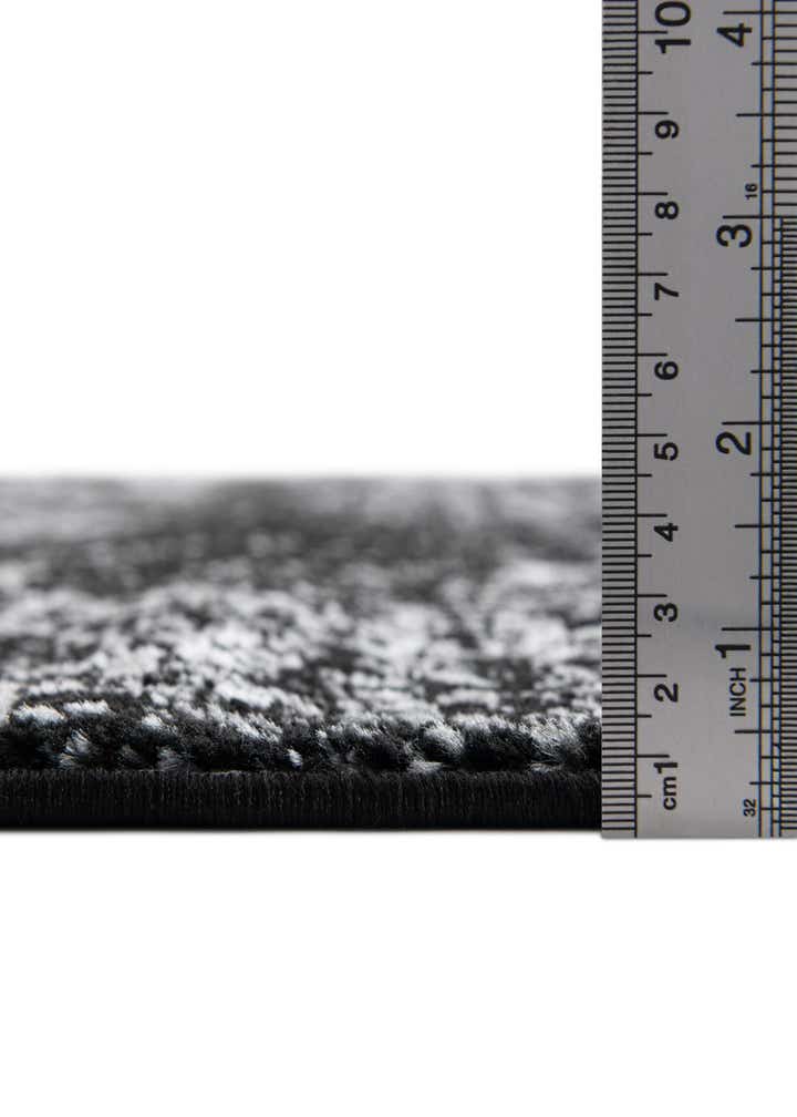 Primary color is Black. Colors in this rug include: Black, Gray, Ivory.