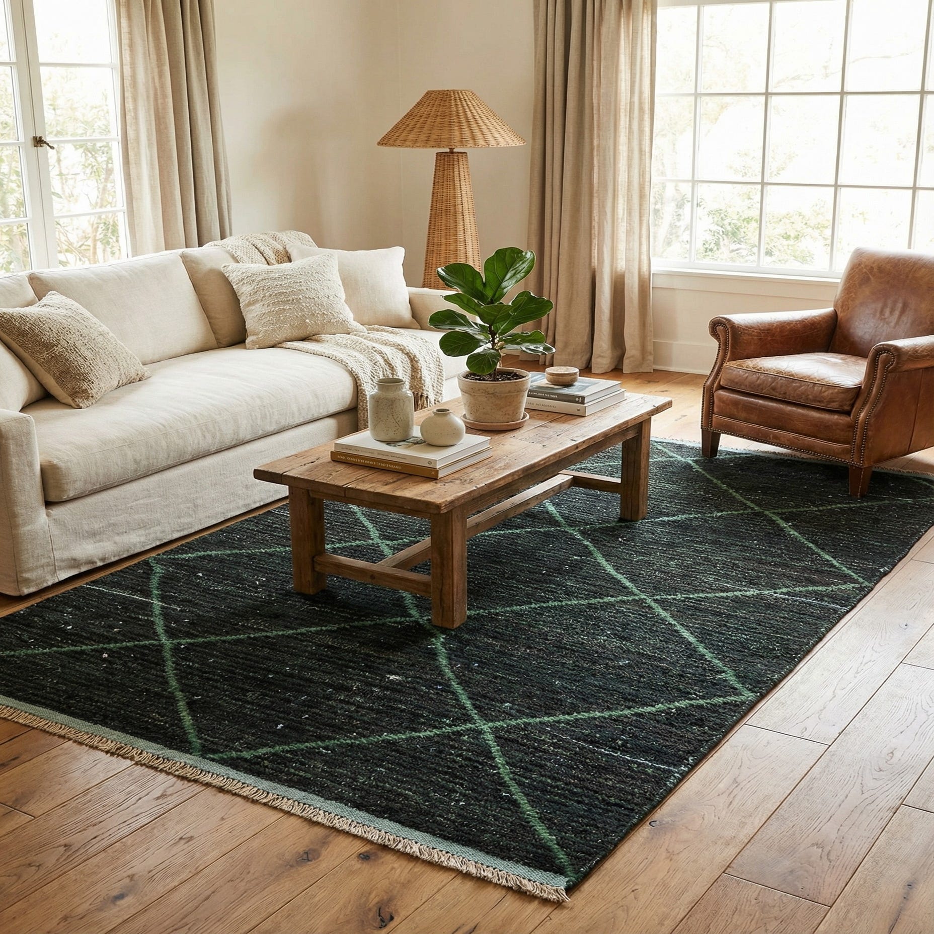 Primary color is Black. Colors in this rug include: Black, Green, Blue.