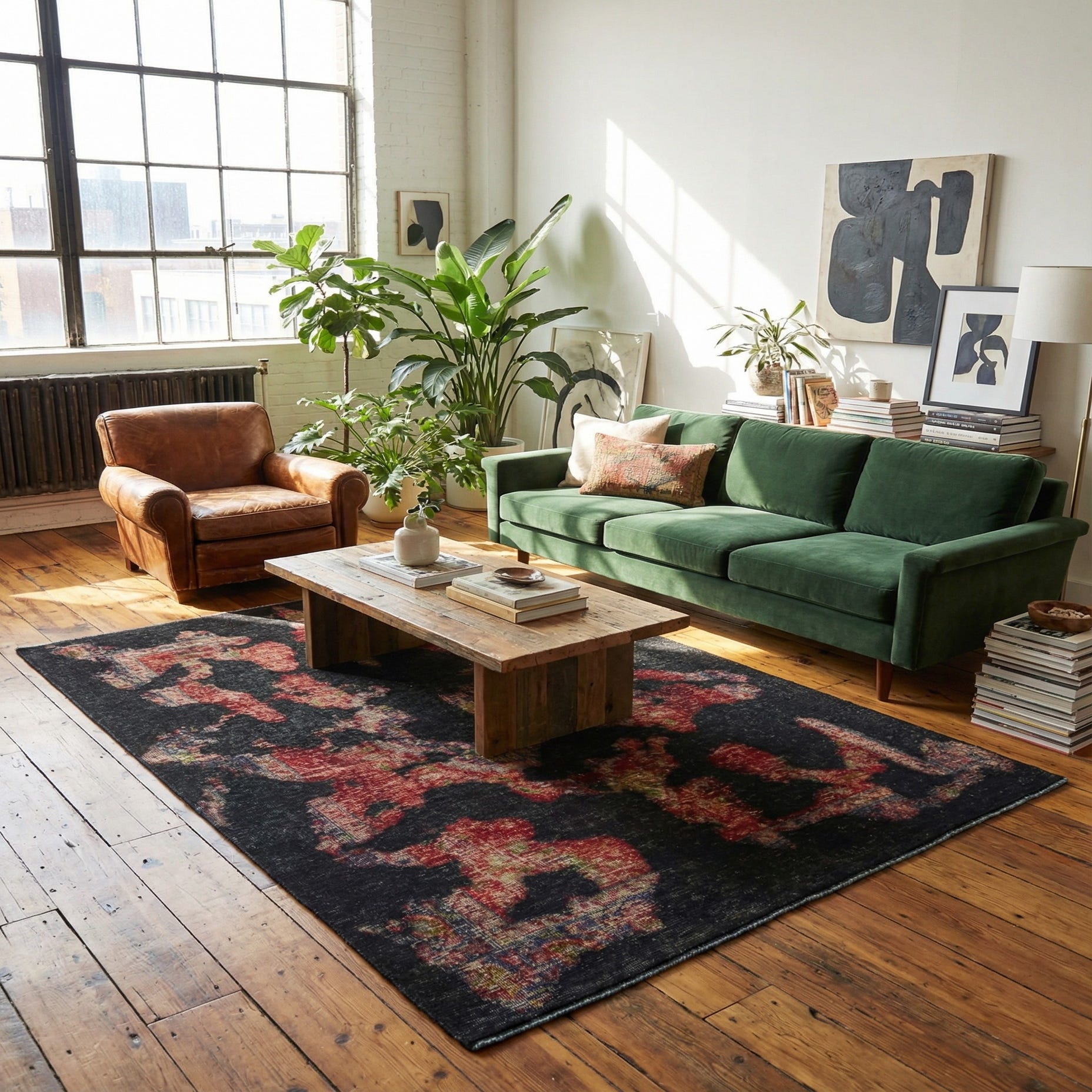 Primary color is Black. Colors in this rug include: Black, Beige, Olive, Red, Ivory.