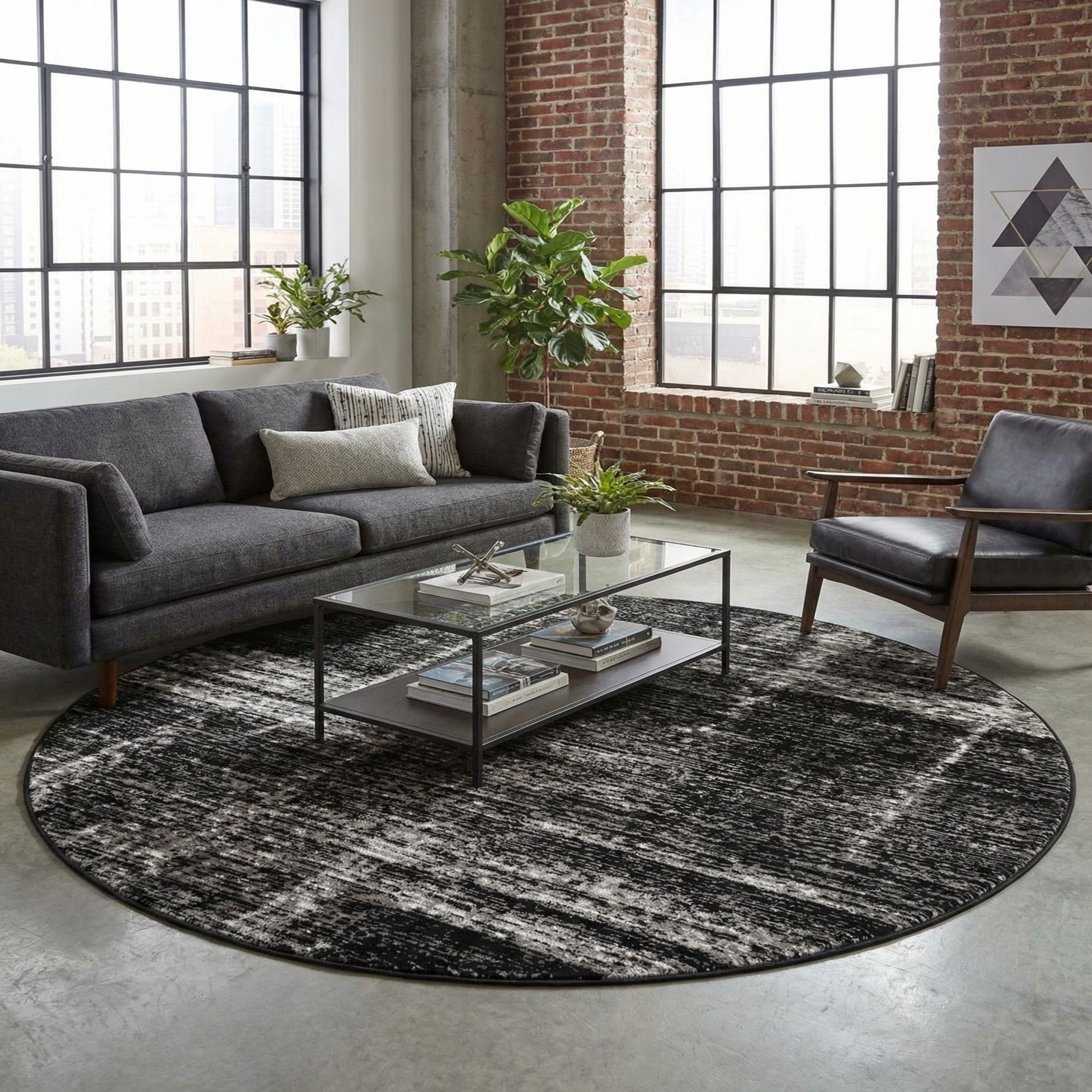 Primary color is Black. Colors in this rug include: Black, Gray, Ivory.