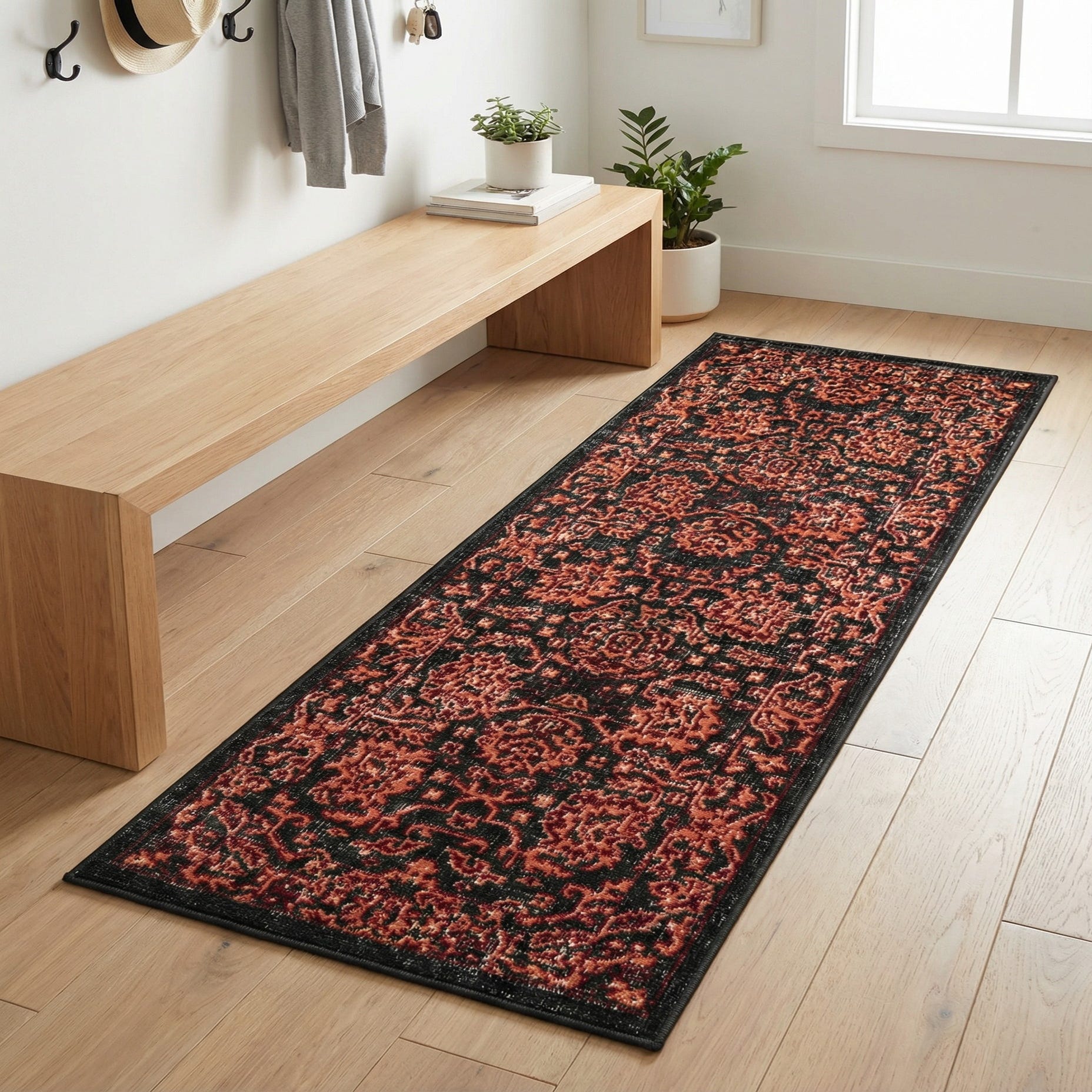 Primary color is Black. Colors in this rug include: Black, Ivory, Orange, Red.