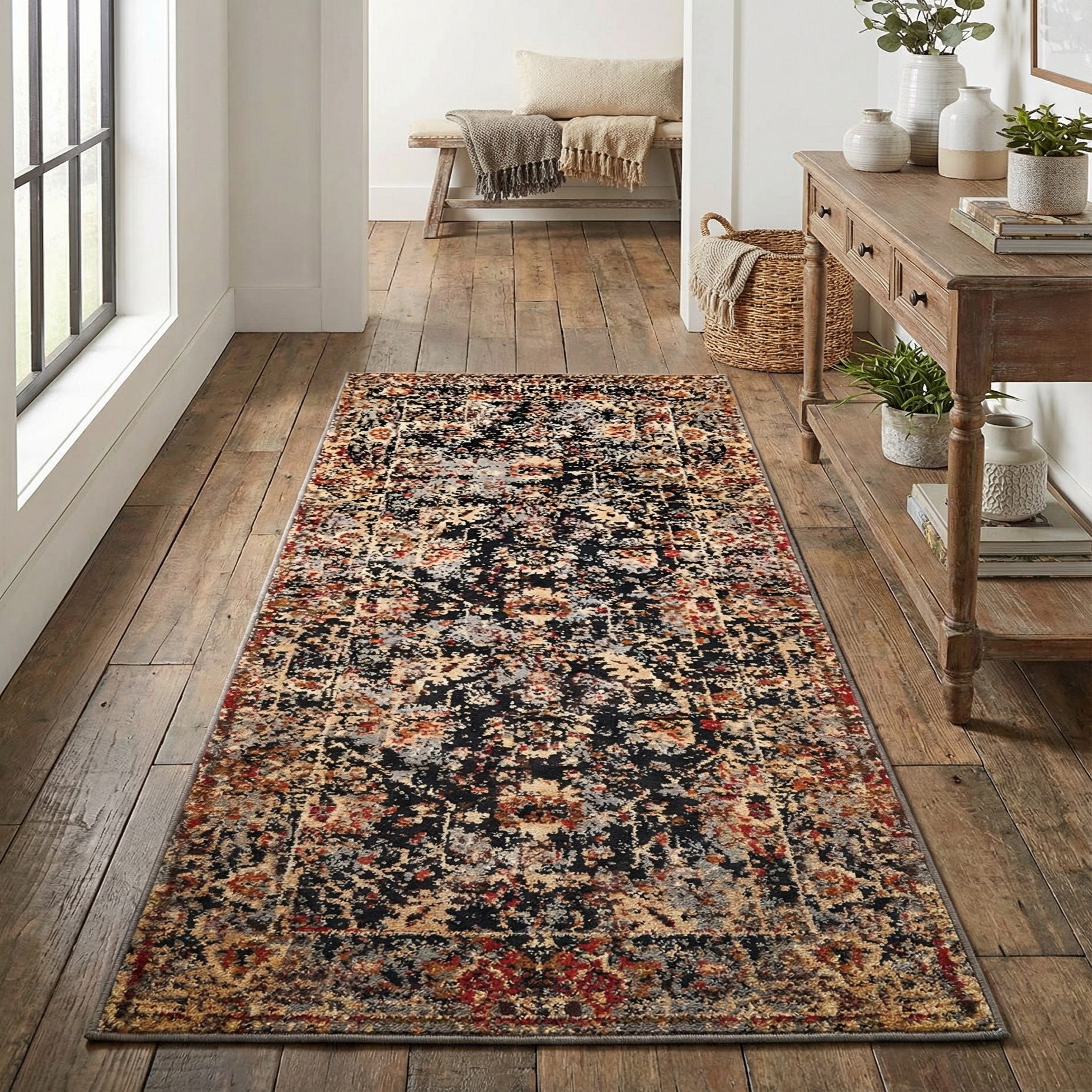 Primary color is Black. Colors in this rug include: Black, Beige, Brown, Gray, Red, Tan.