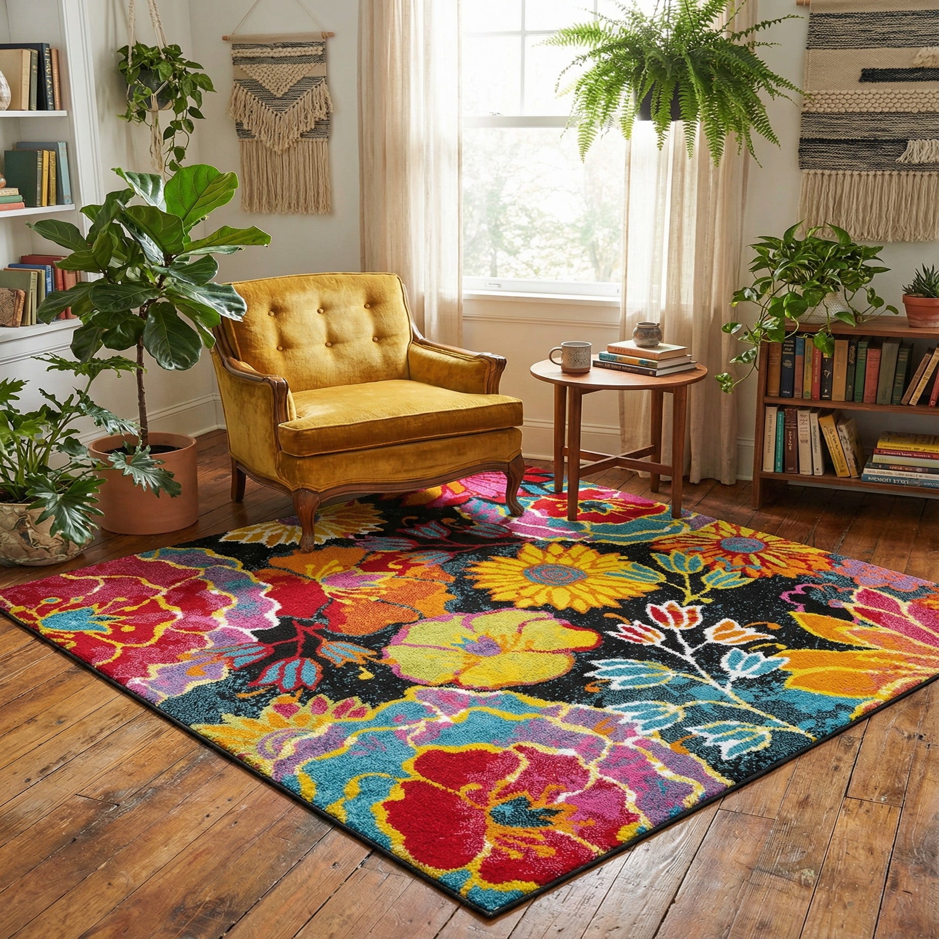 Primary color is Black. Colors in this rug include: Black, Green, Ivory, Orange, Red, Yellow, Blue.