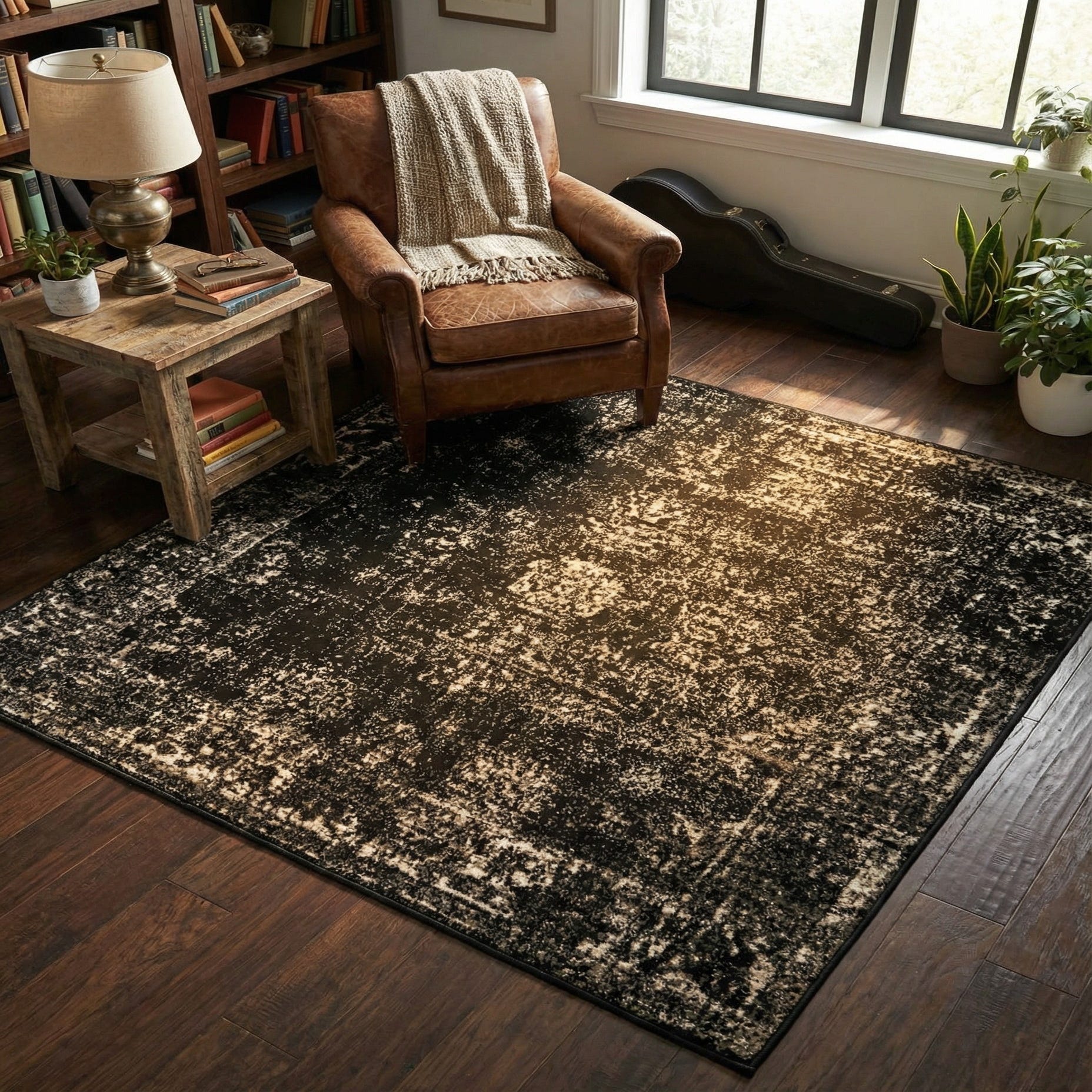 Primary color is Black. Colors in this rug include: Black, Gray, Ivory.