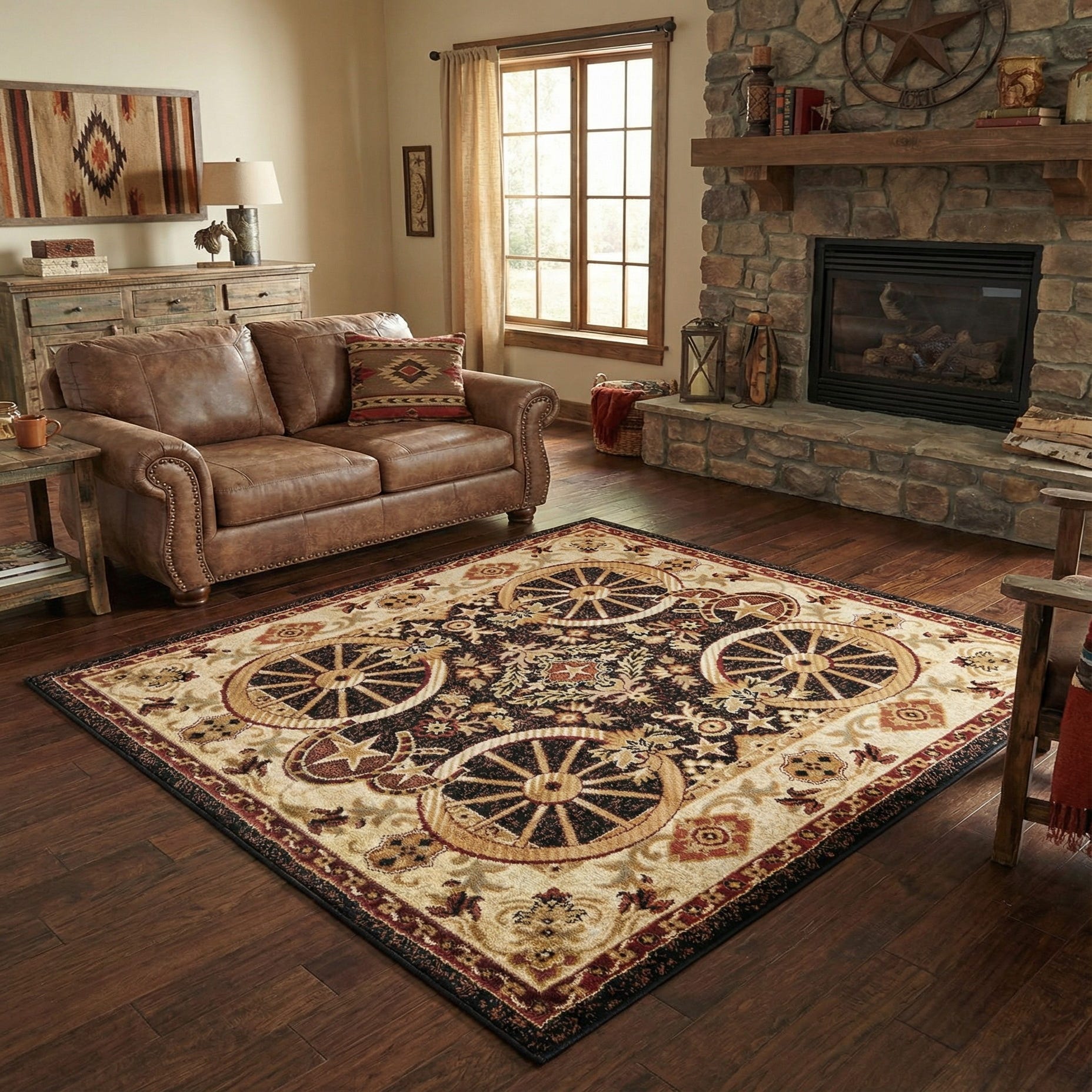 Primary color is Black. Colors in this rug include: Black, Beige, Brown, Red, Ivory.
