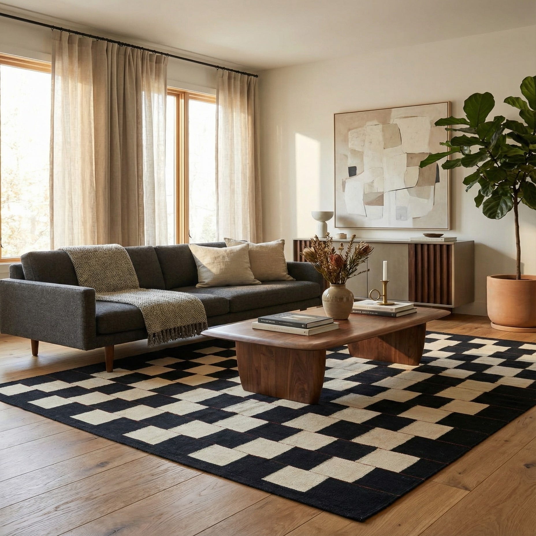 Primary color is Black. Colors in this rug include: Black, Cream, Red.