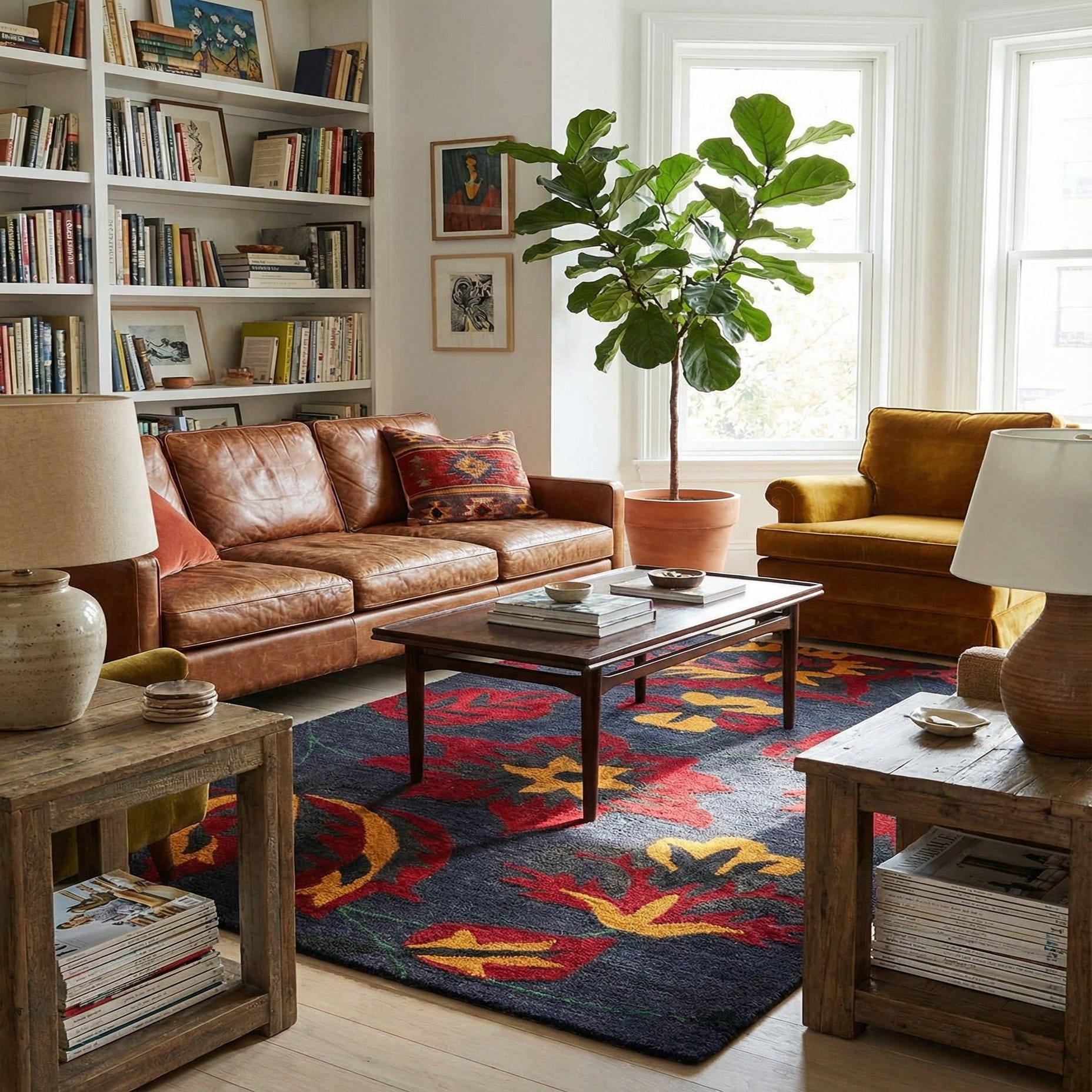 Primary color is Black. Colors in this rug include: Black, Green, Red, Yellow.