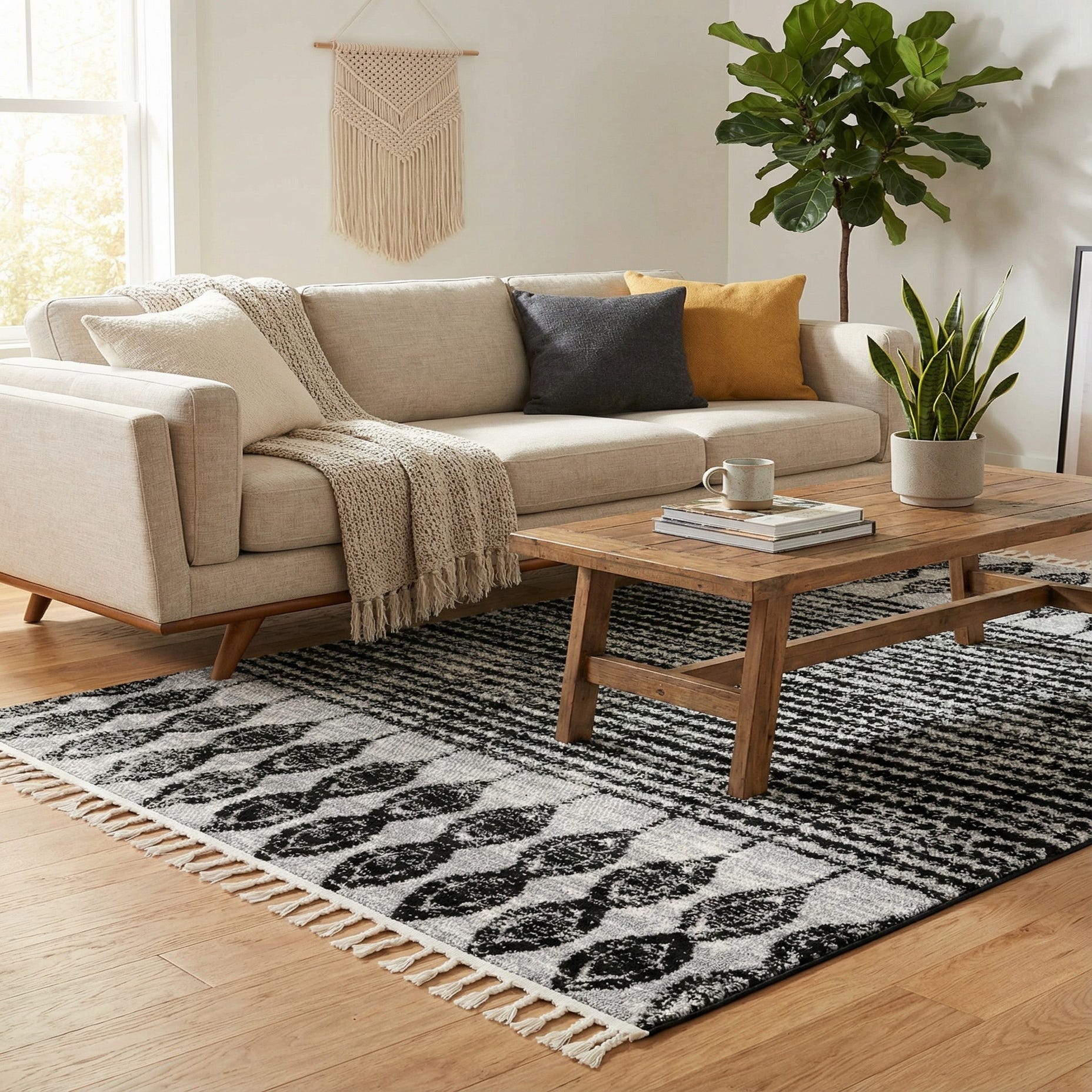 Primary color is Black. Colors in this rug include: Black, Gray, Ivory.
