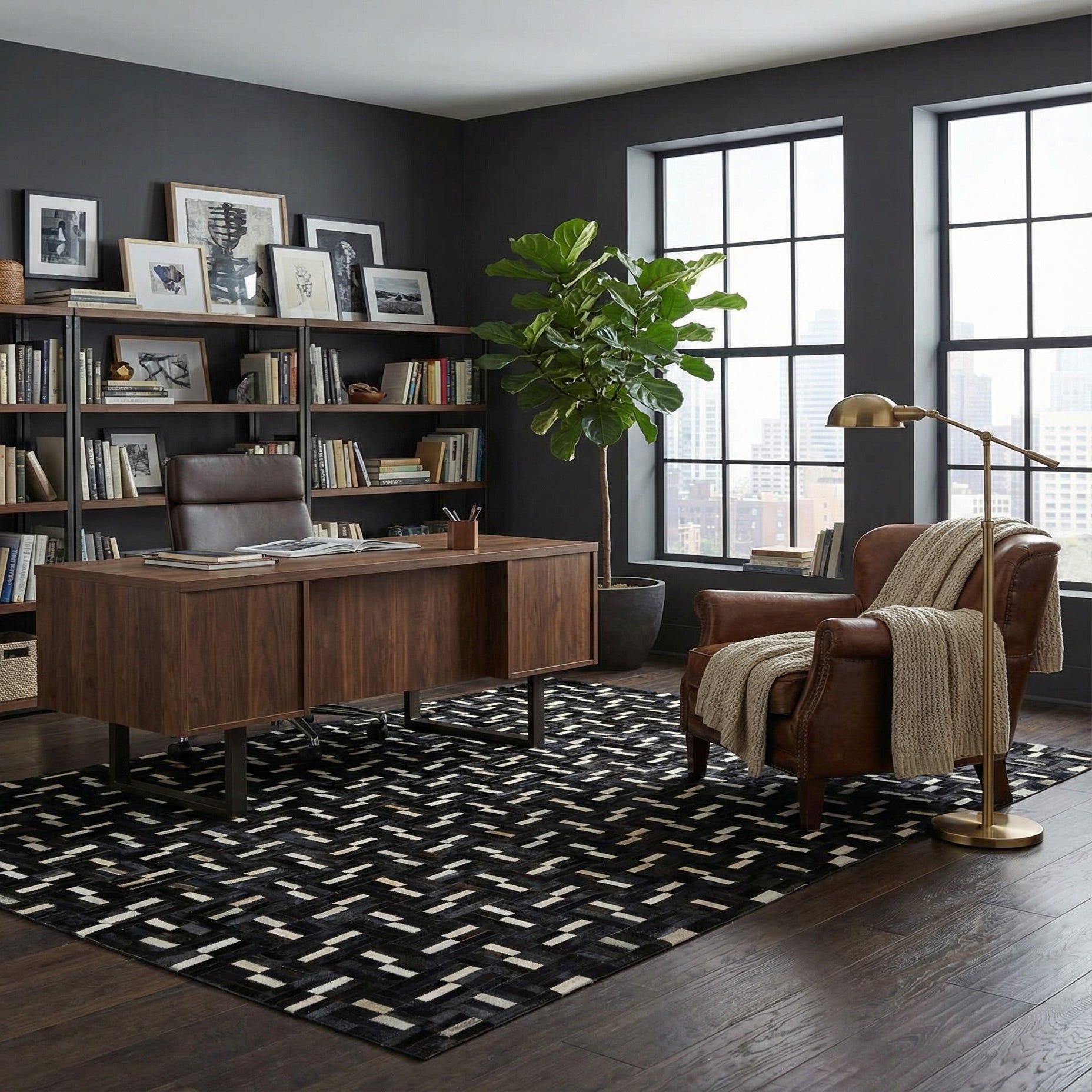 Primary color is Black. Colors in this rug include: Black, Brown, Ivory.