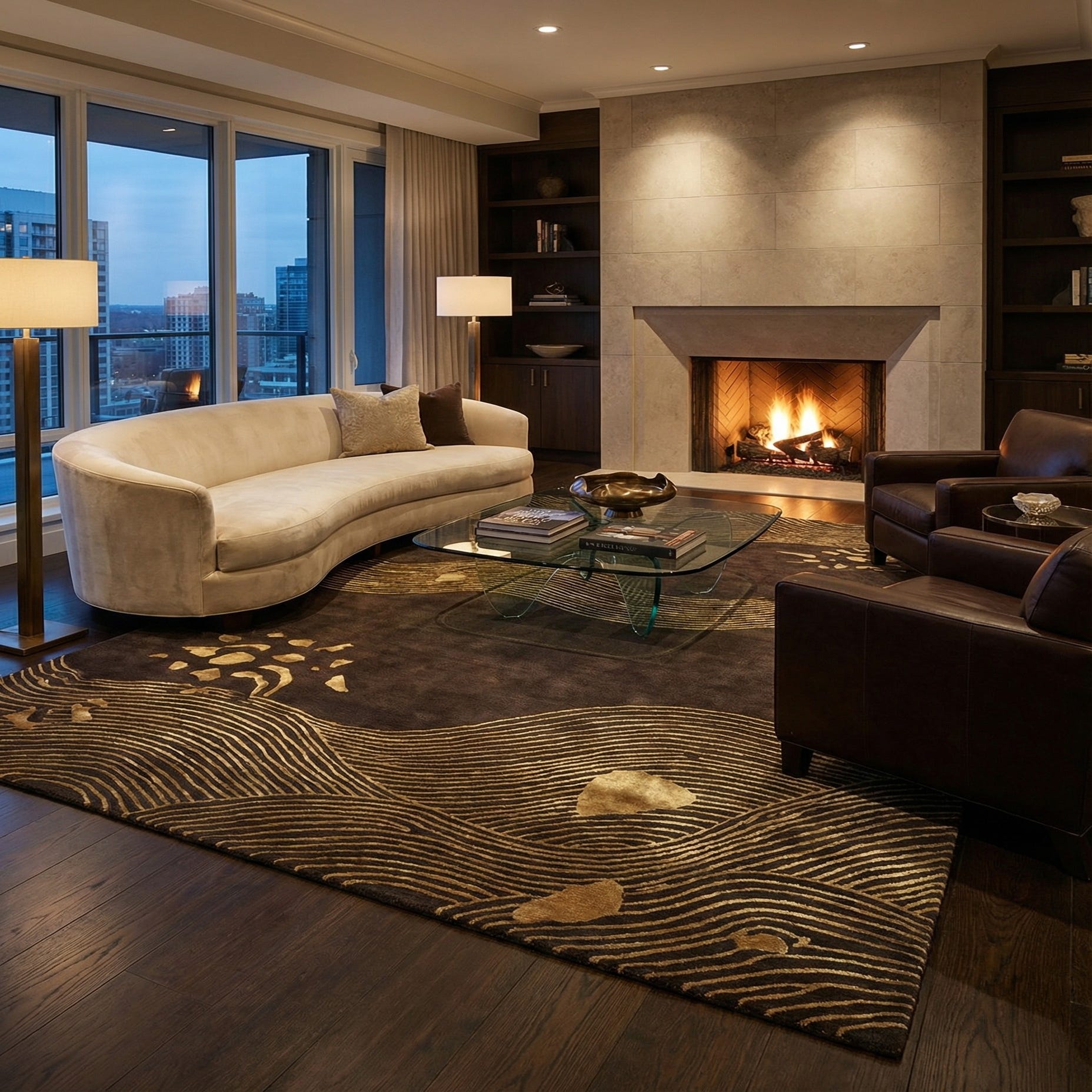 Primary color is Black. Colors in this rug include: Black, Brown, Light Brown.