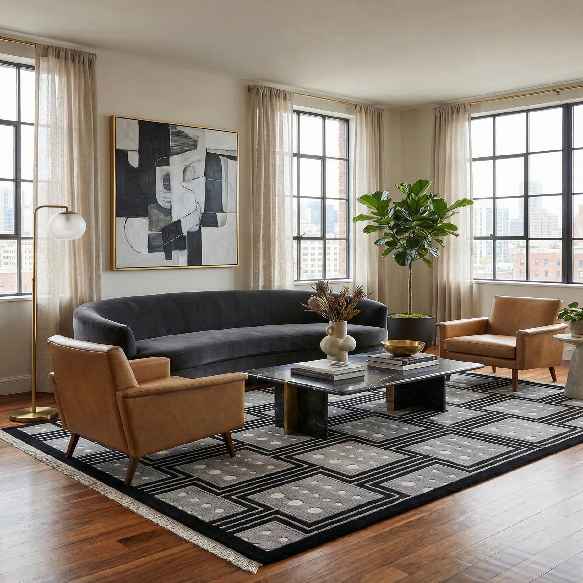 Primary color is Black. Colors in this rug include: Black, Beige, Gray, Silver.