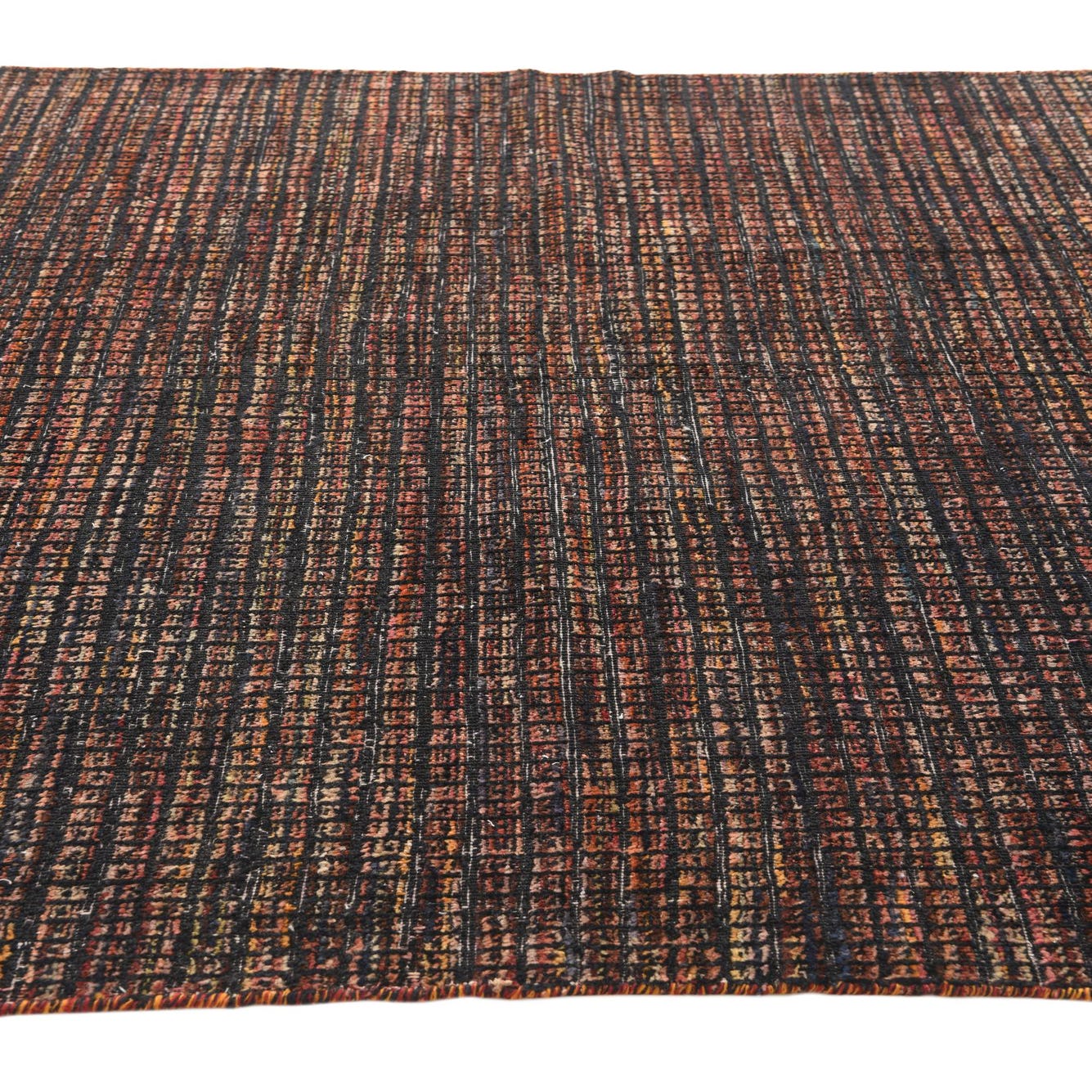 Primary color is Black. Colors in this rug include: Black, Beige, Blue, Brown, Olive, Rust Red, Yellow.