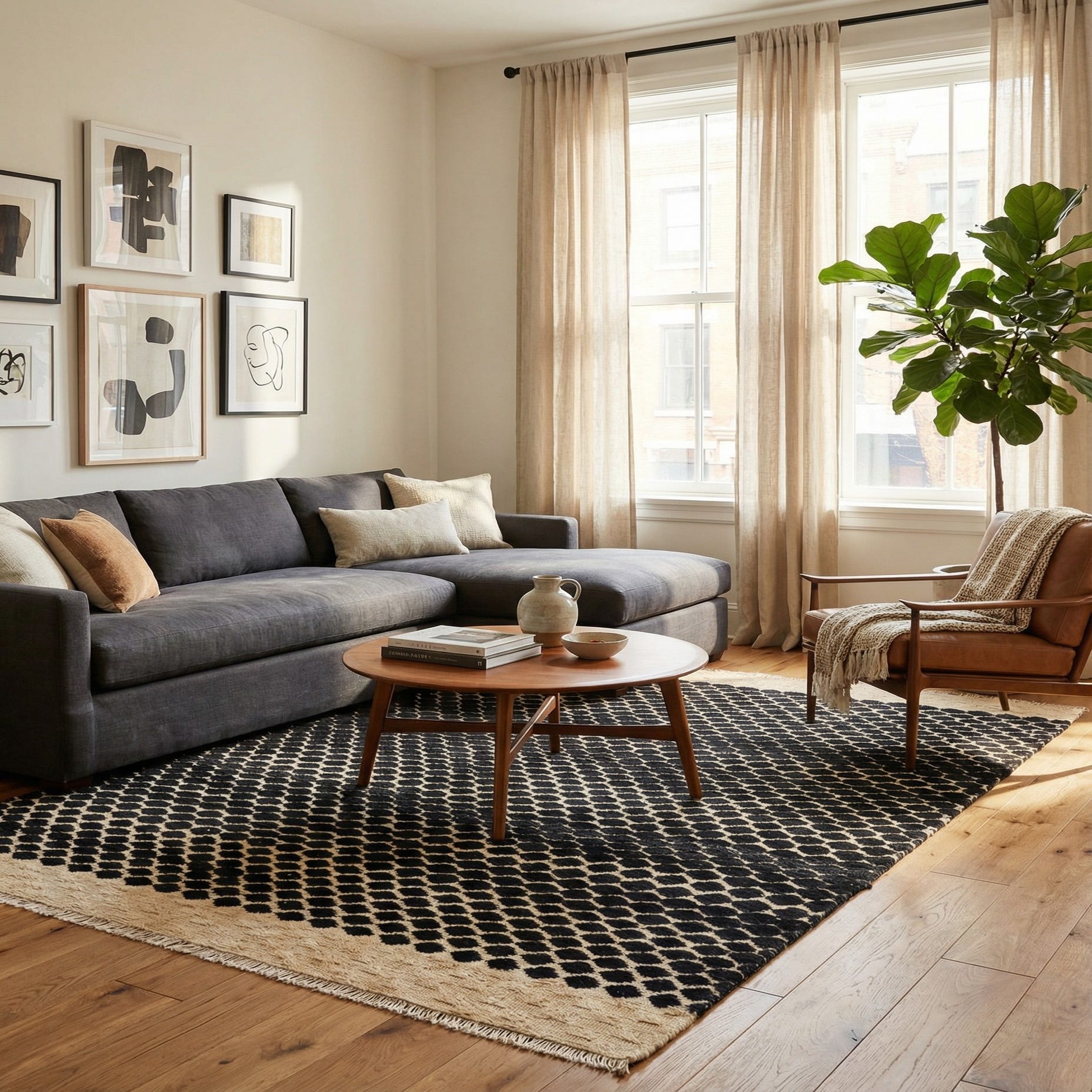 Primary color is Black. Colors in this rug include: Black, Beige.
