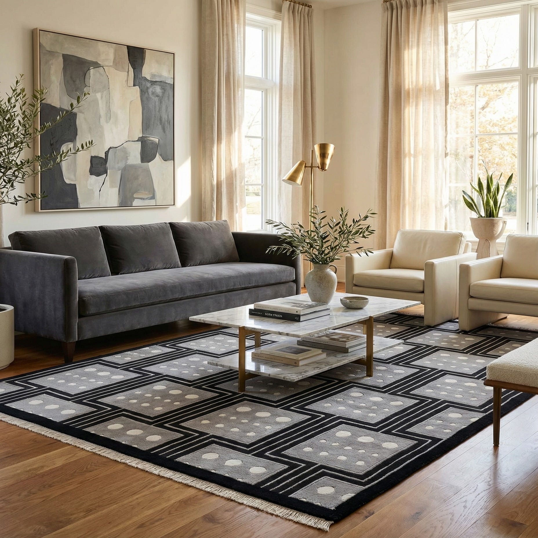 Primary color is Black. Colors in this rug include: Black, Gray, Silver.