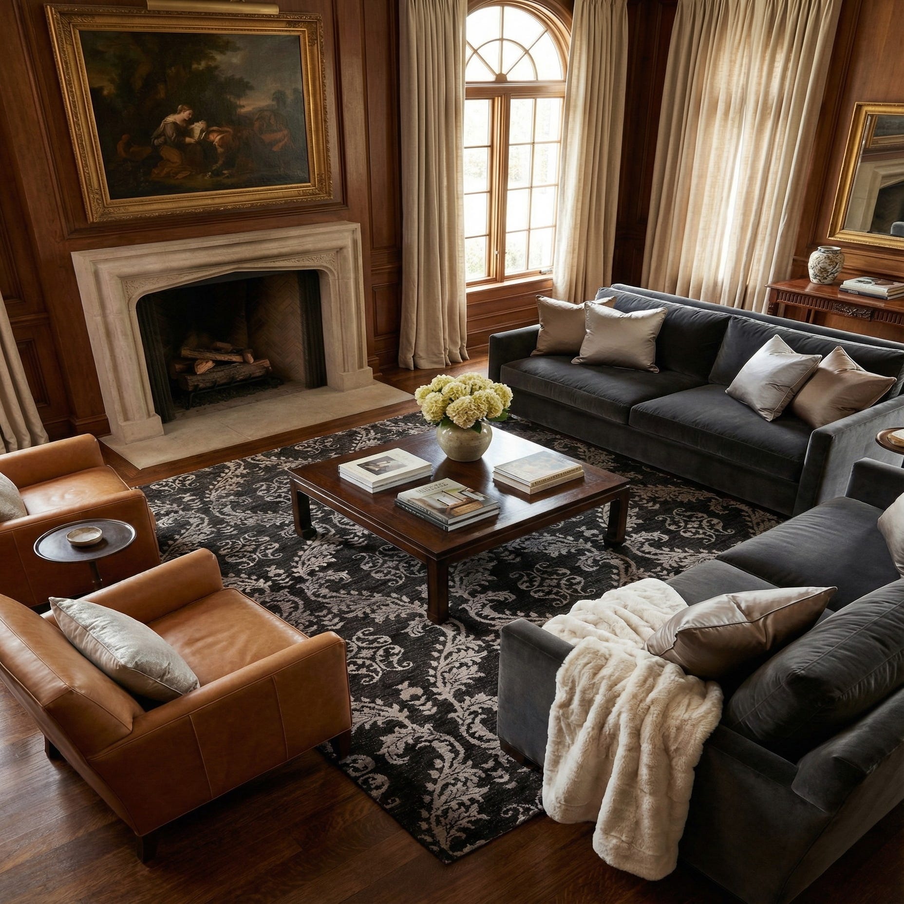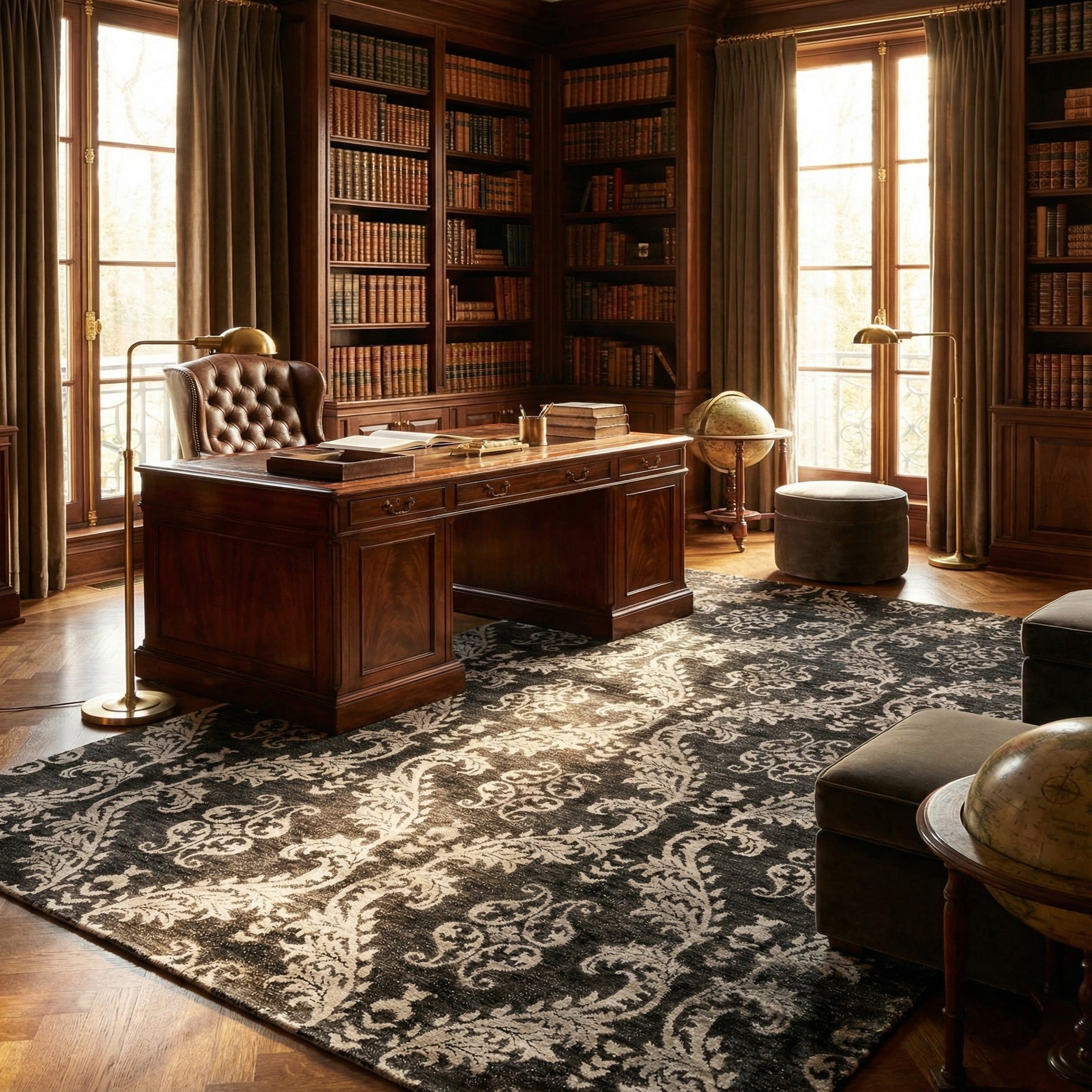 Primary color is Black. Colors in this rug include: Black, Silver.
