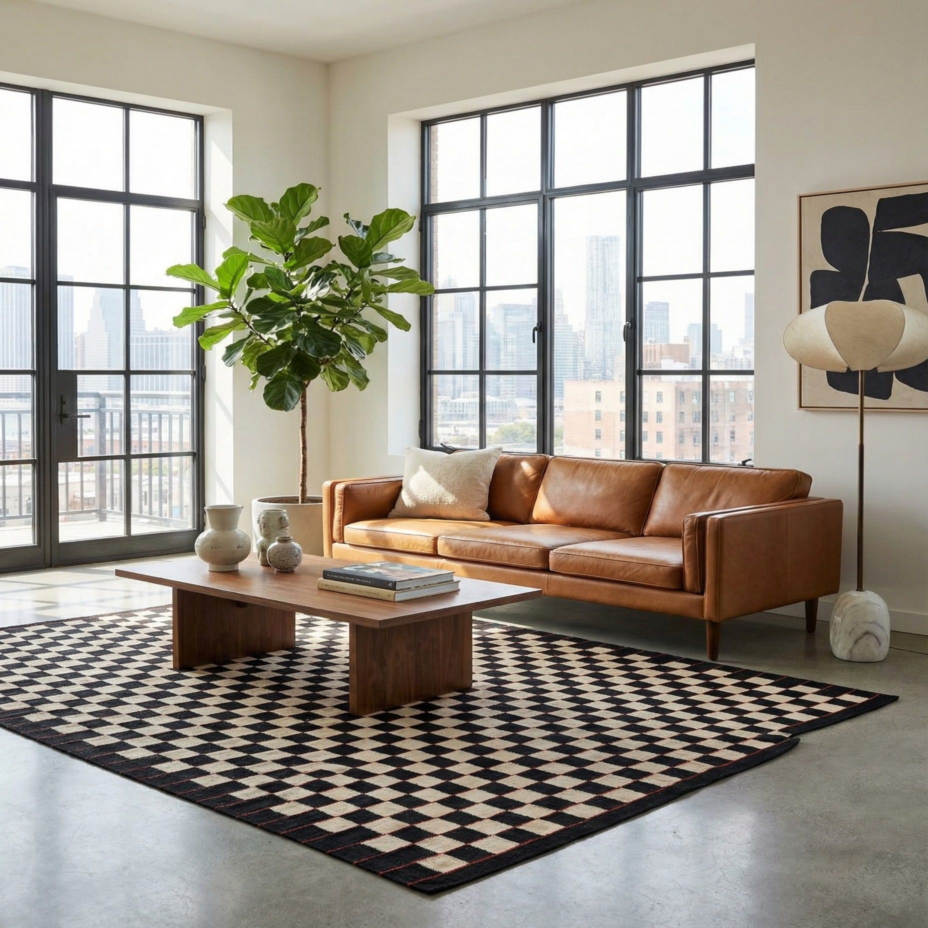 Primary color is Black. Colors in this rug include: Black, Ivory, Orange.