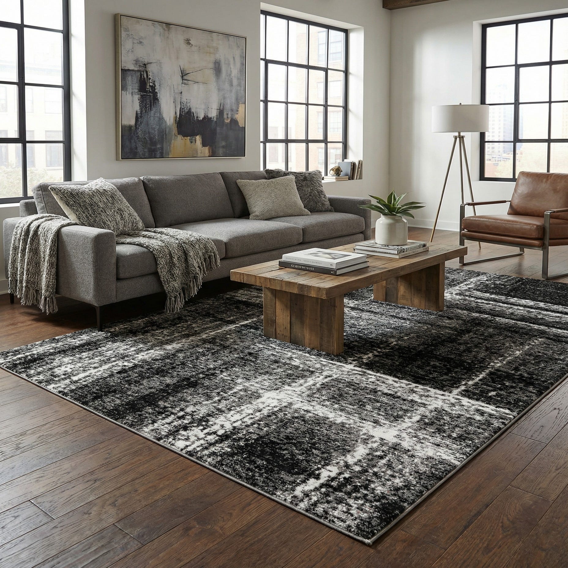 Primary color is Black. Colors in this rug include: Black, Gray, Ivory.