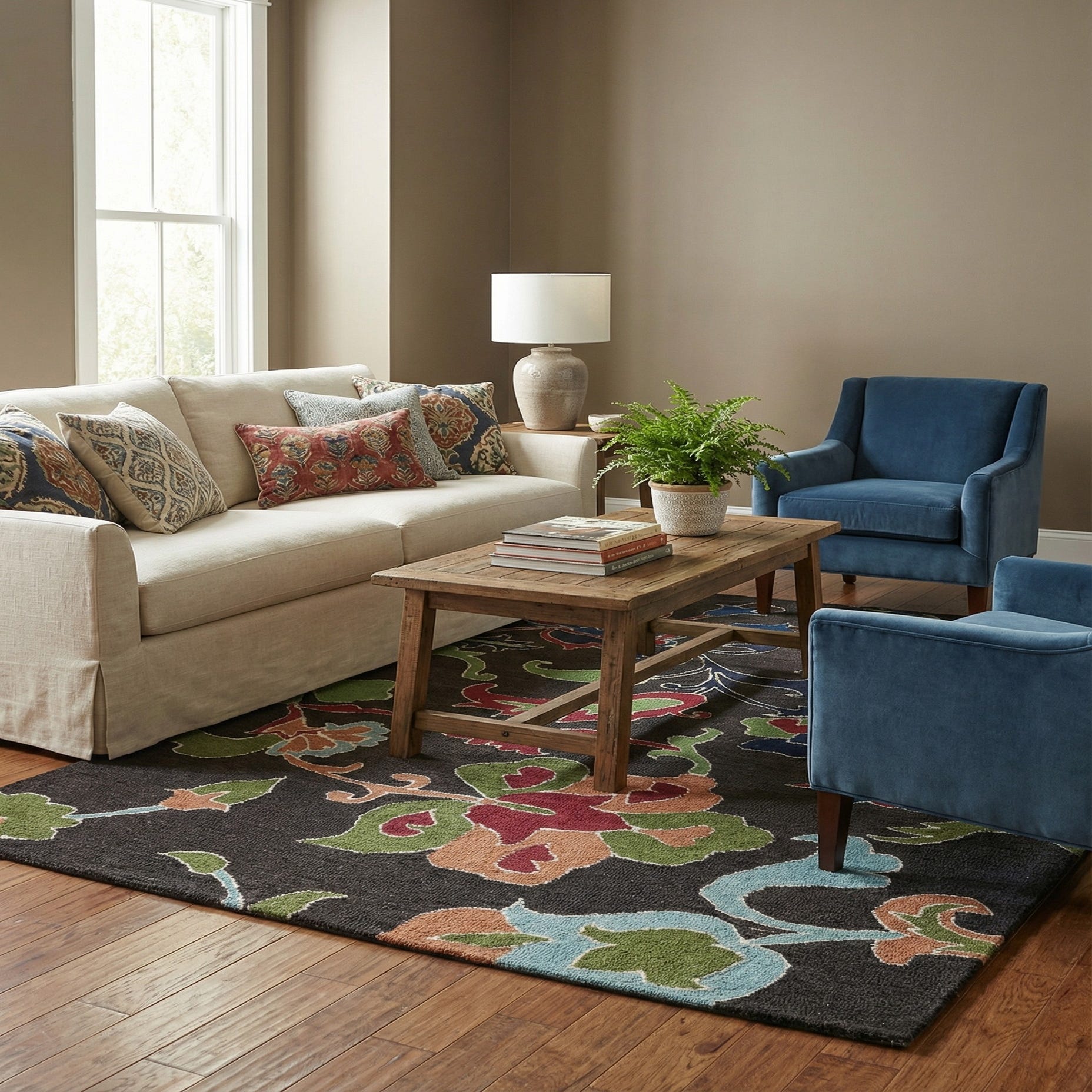 Primary color is Black. Colors in this rug include: Black, Blue, Green, Red, Terracotta, Light Blue, Ivory, Navy Blue.