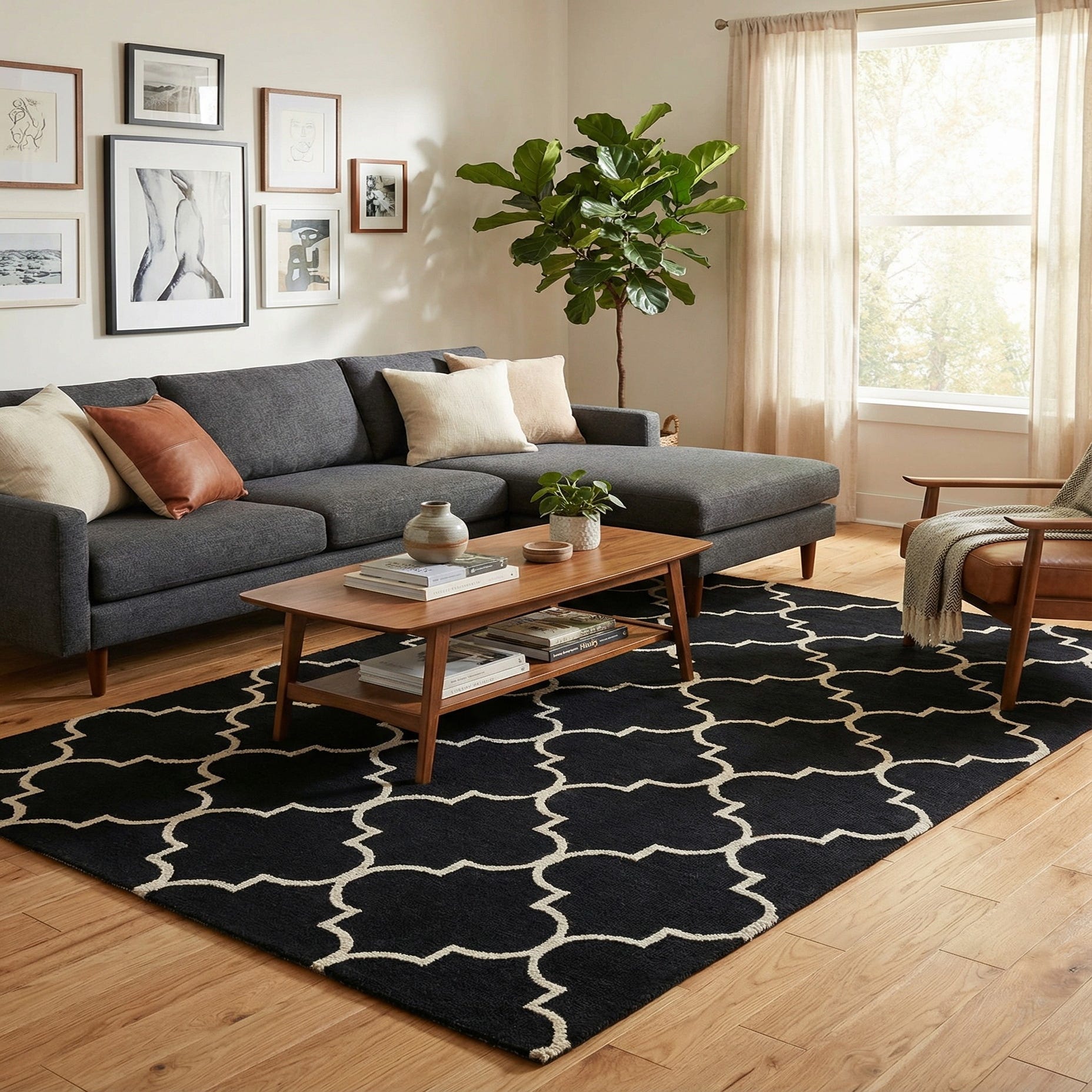 Primary color is Black. Colors in this rug include: Black, Ivory.