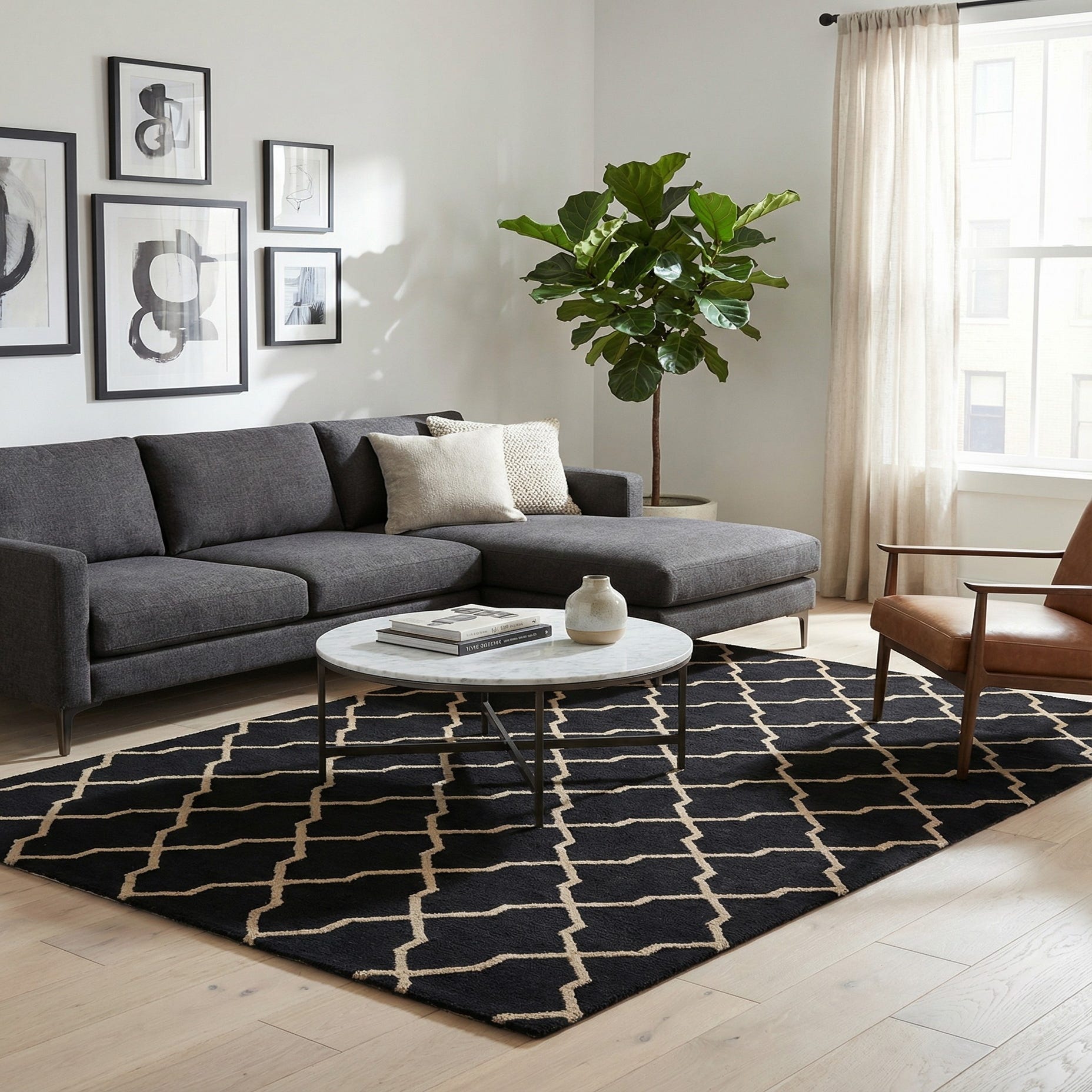 Primary color is Black. Colors in this rug include: Black, Ivory.
