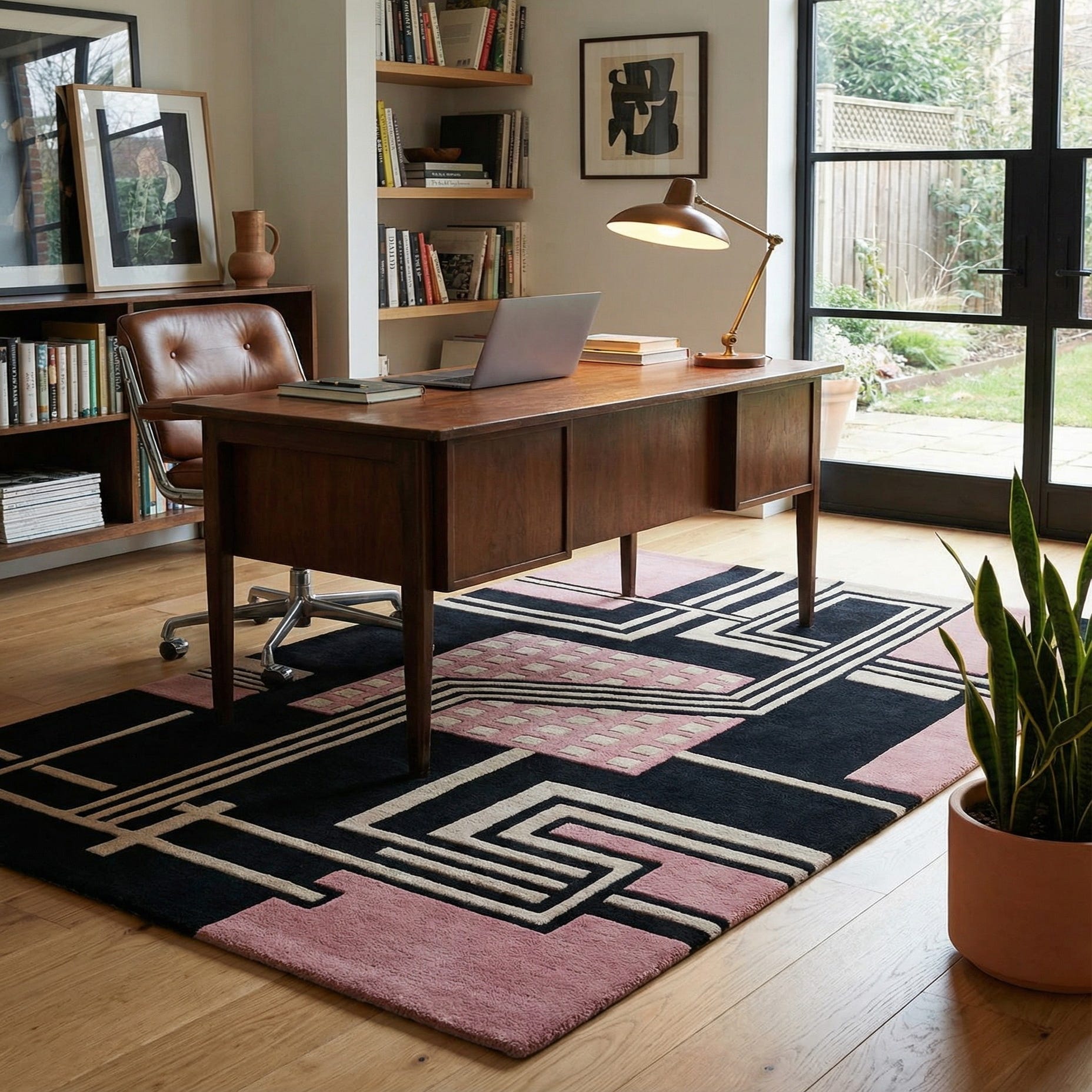 Primary color is Black. Colors in this rug include: Black, Pink, Light Salmon.