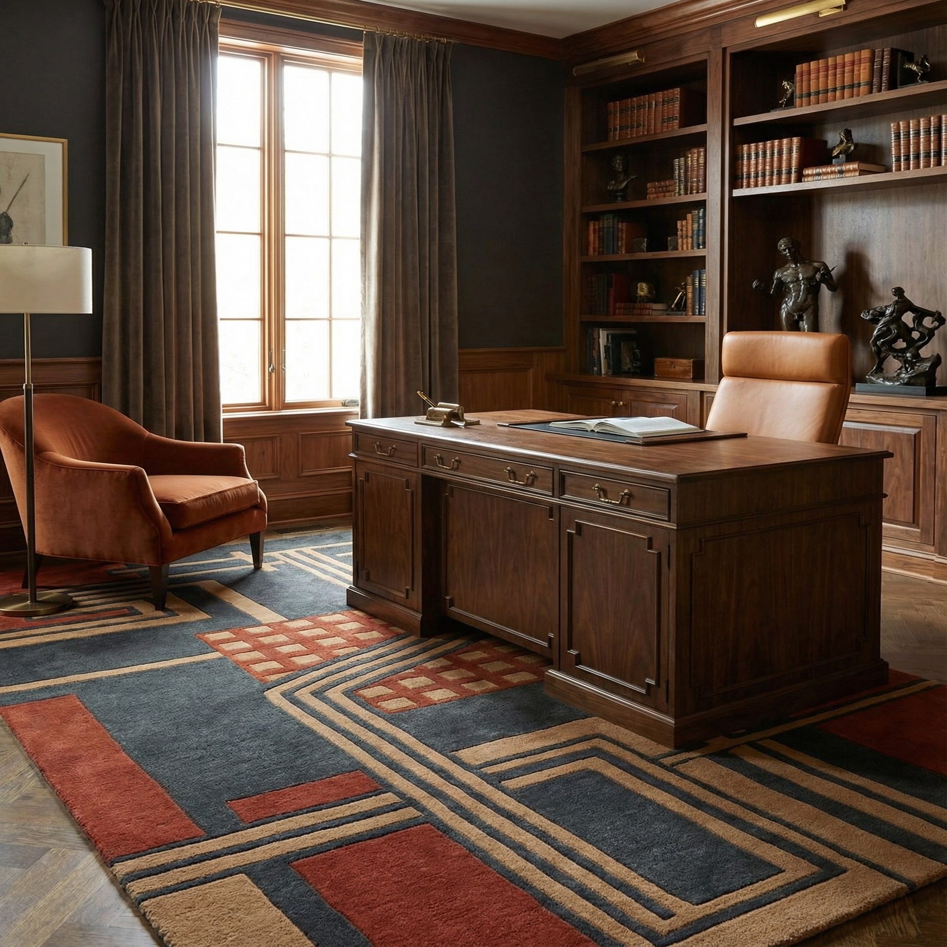 Primary color is Black. Colors in this rug include: Black, Light Brown, Rust Red.