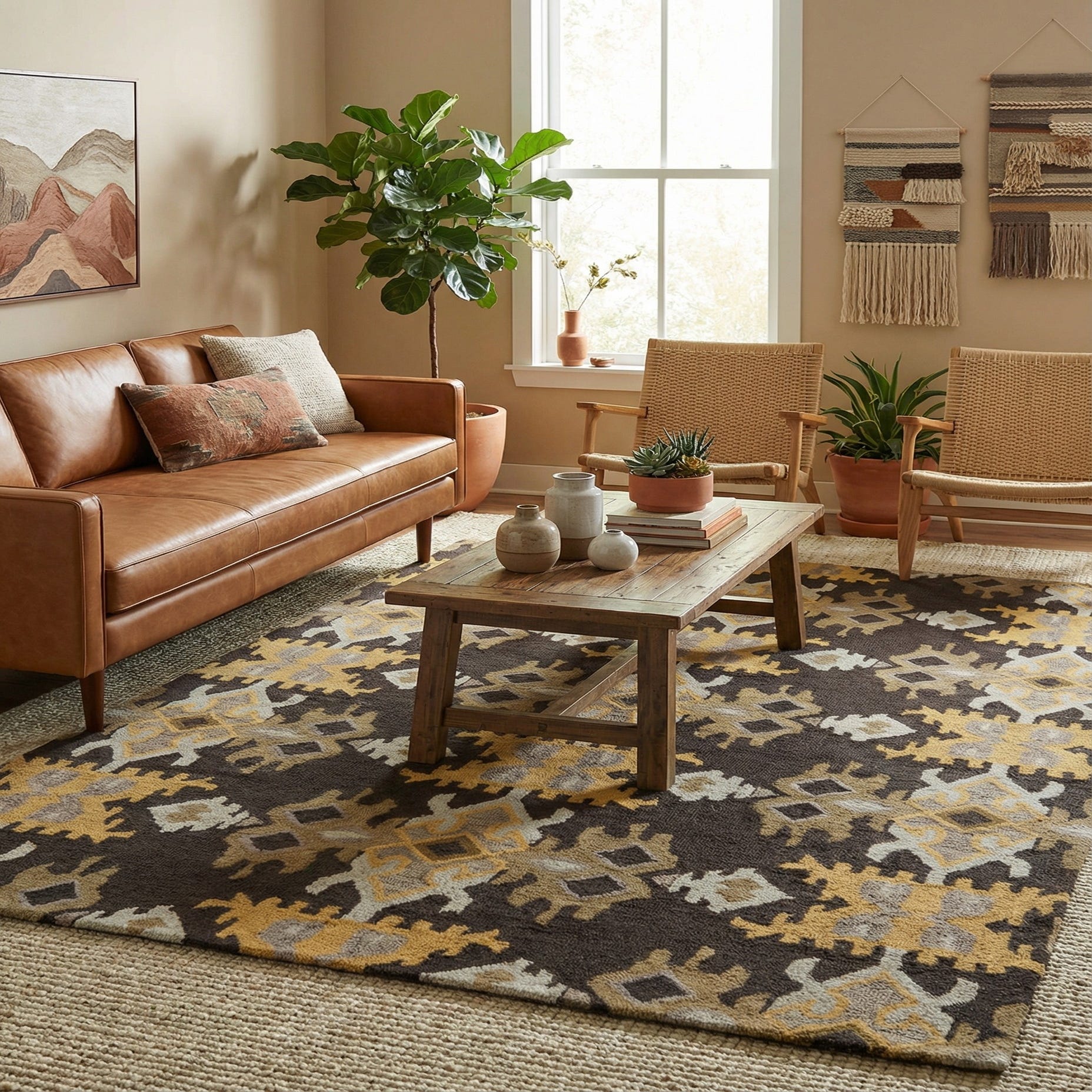 Primary color is Black. Colors in this rug include: Black, Light Blue, Olive, Gold, Gray.