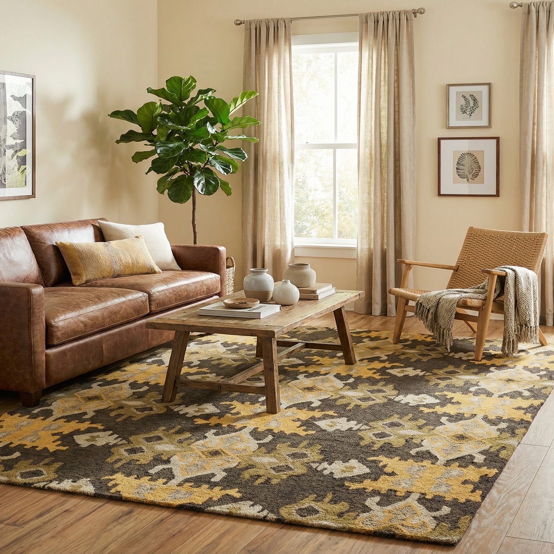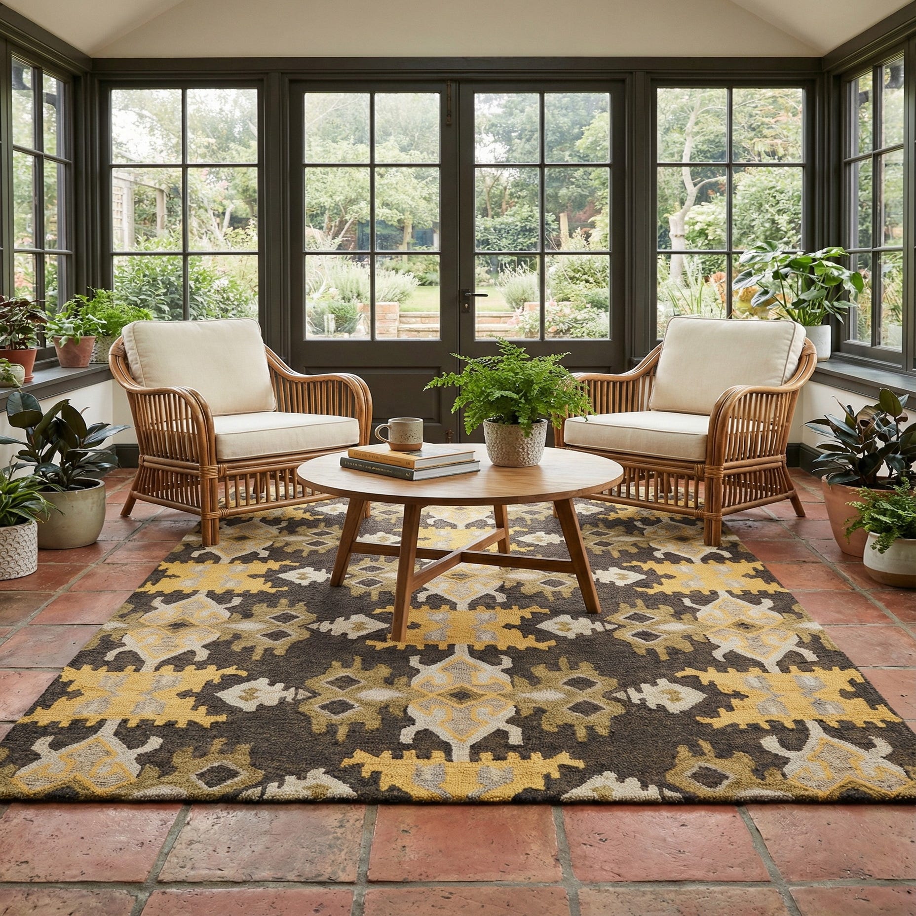Primary color is Black. Colors in this rug include: Black, Gray, Yellow, Light Brown, Ivory.