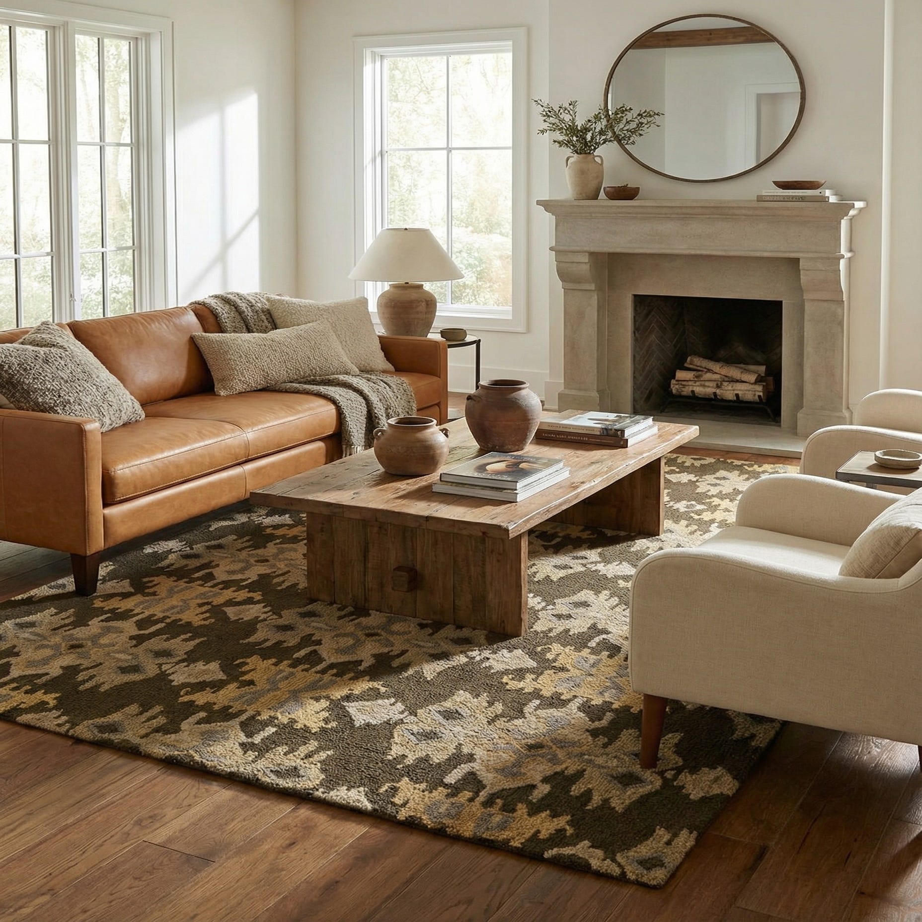 Primary color is Black. Colors in this rug include: Black, Ivory, Gray, Yellow, Olive.