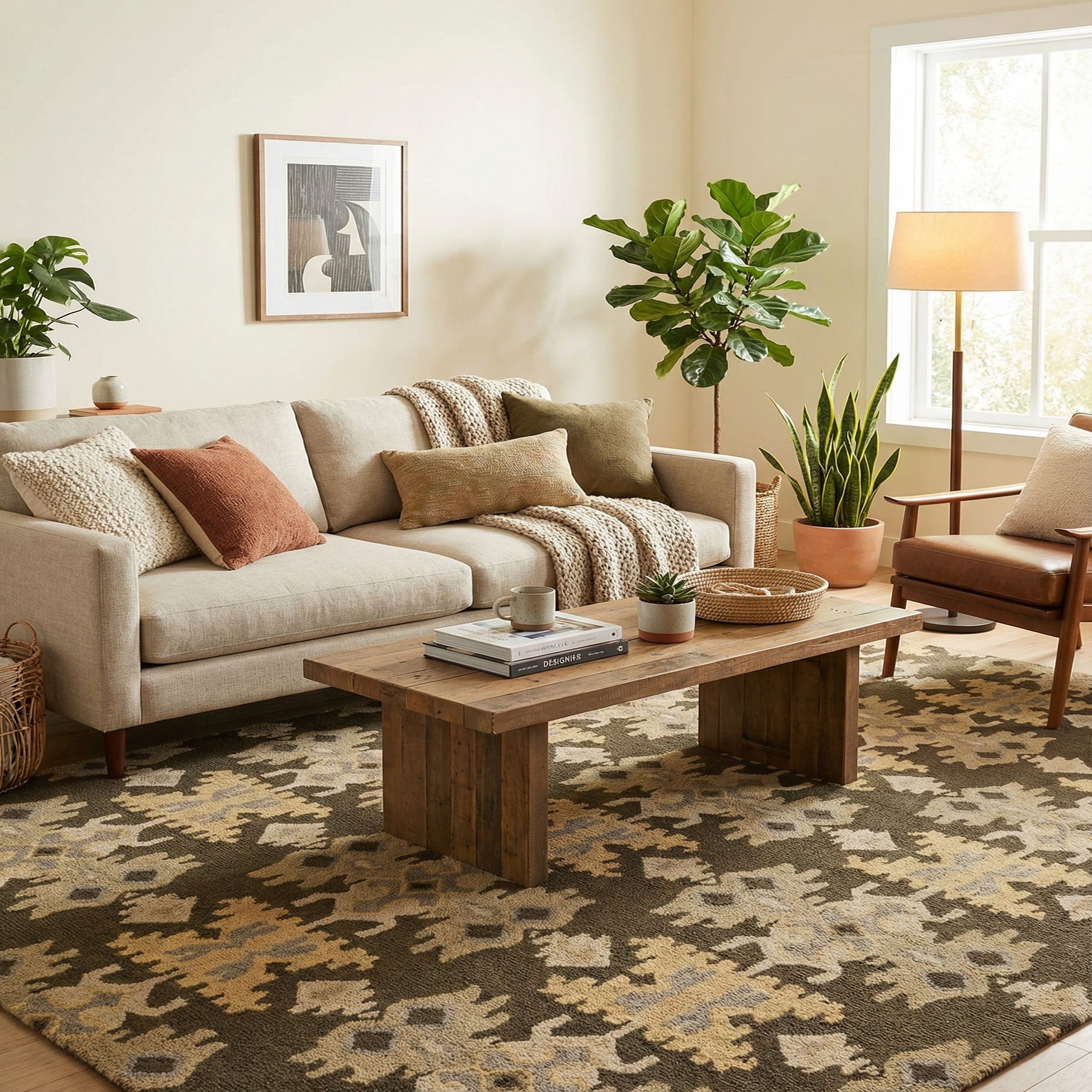 Primary color is Black. Colors in this rug include: Black, Gray, Ivory, Yellow.