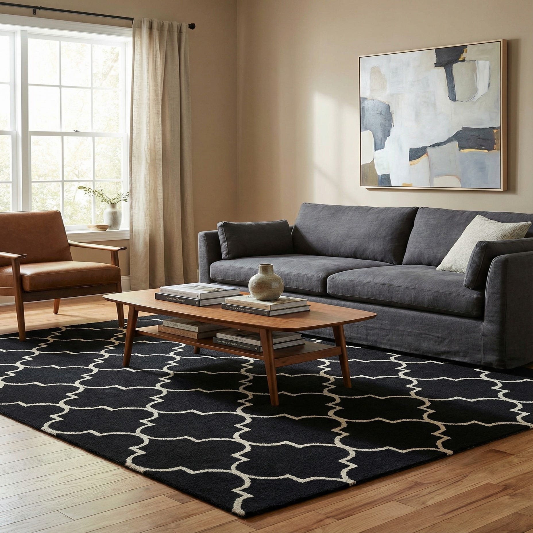 Primary color is Black. Colors in this rug include: Black, Ivory.
