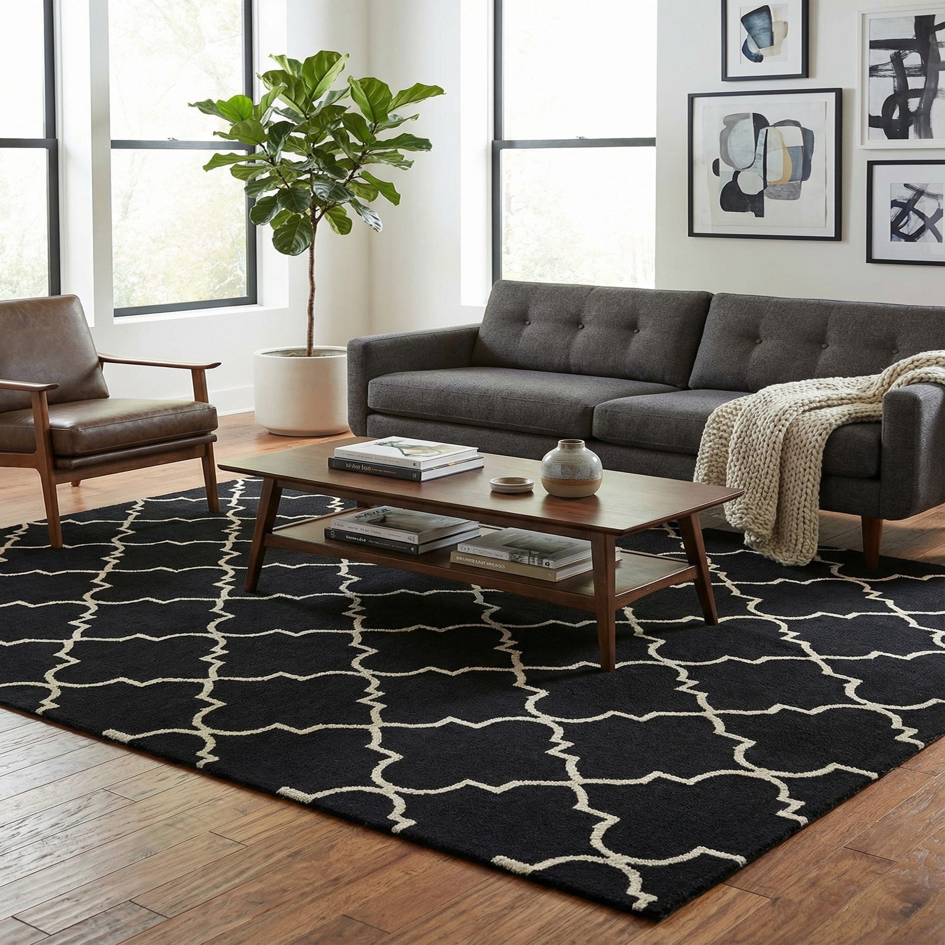 Primary color is Black. Colors in this rug include: Black, Ivory.