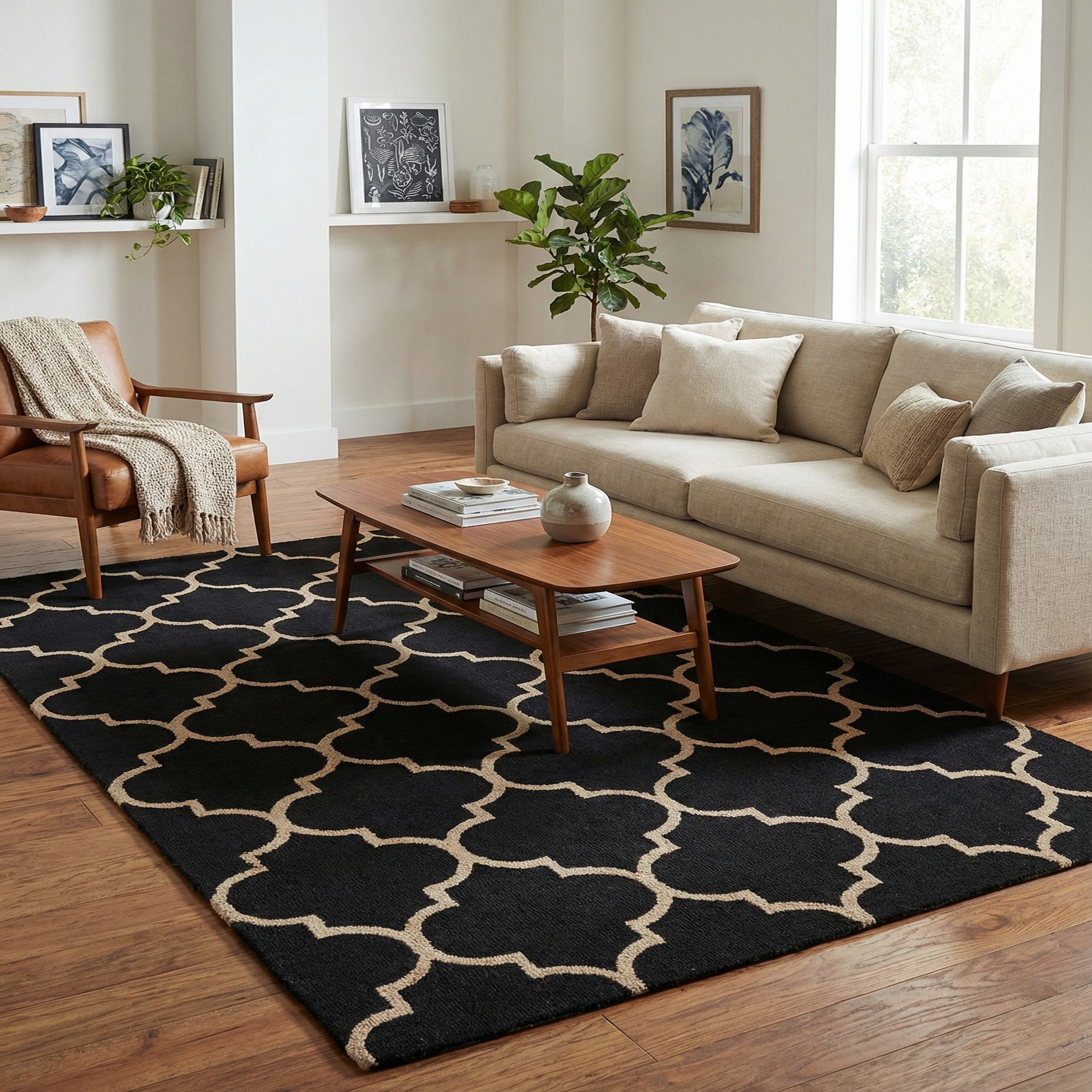 Primary color is Black. Colors in this rug include: Black, Ivory.