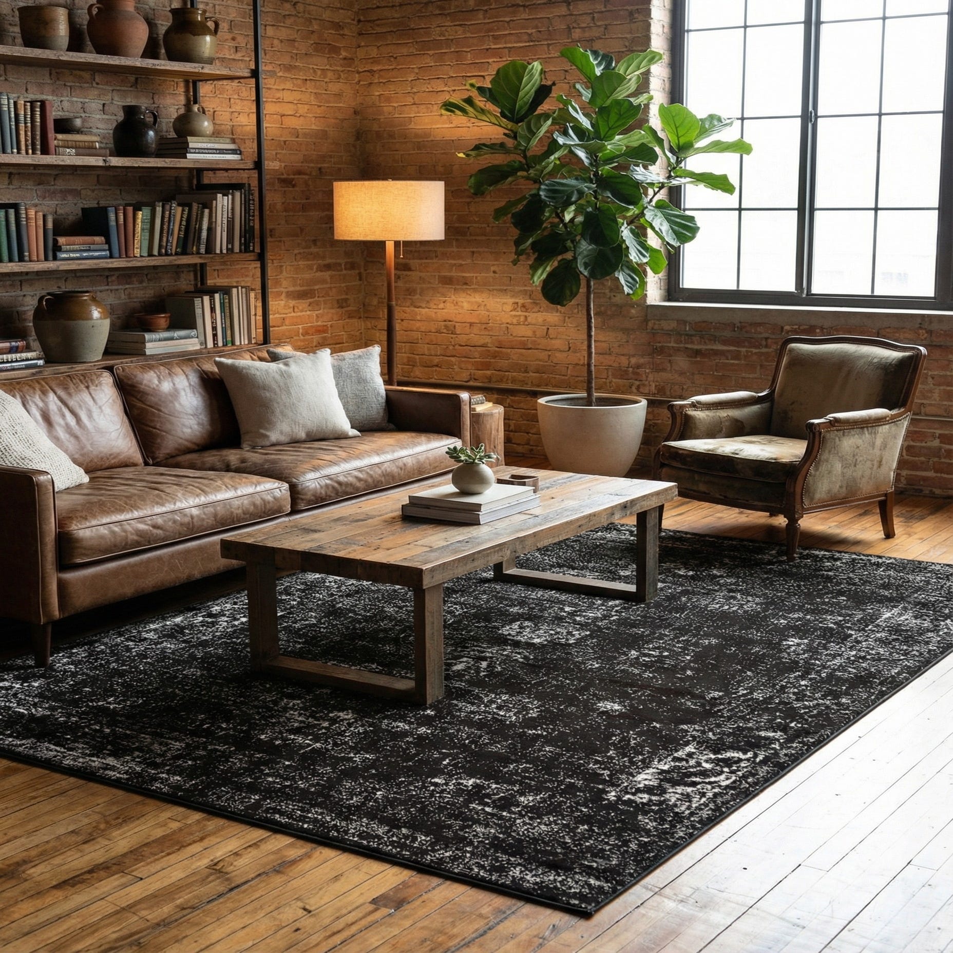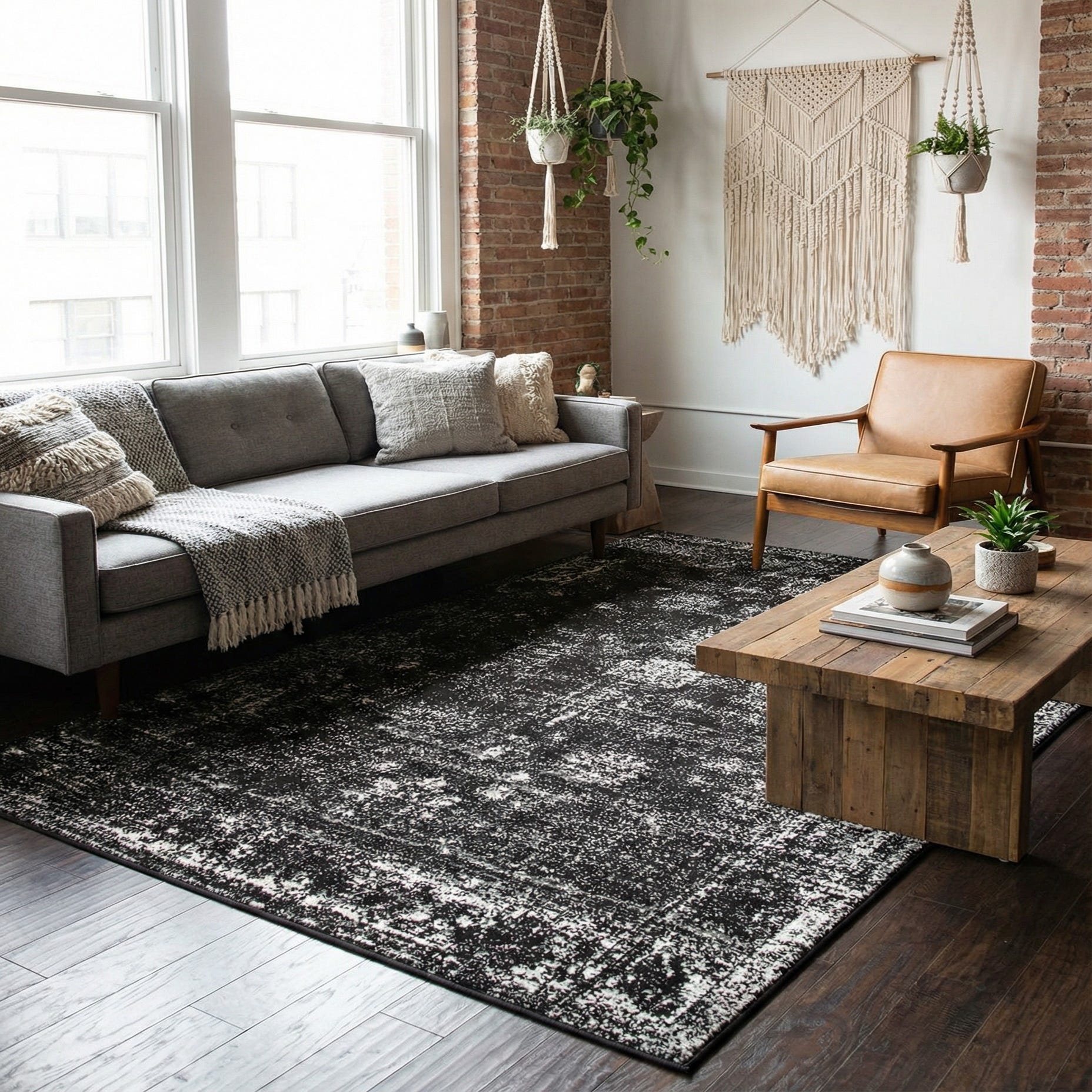 Primary color is Black. Colors in this rug include: Black, Gray, Ivory.