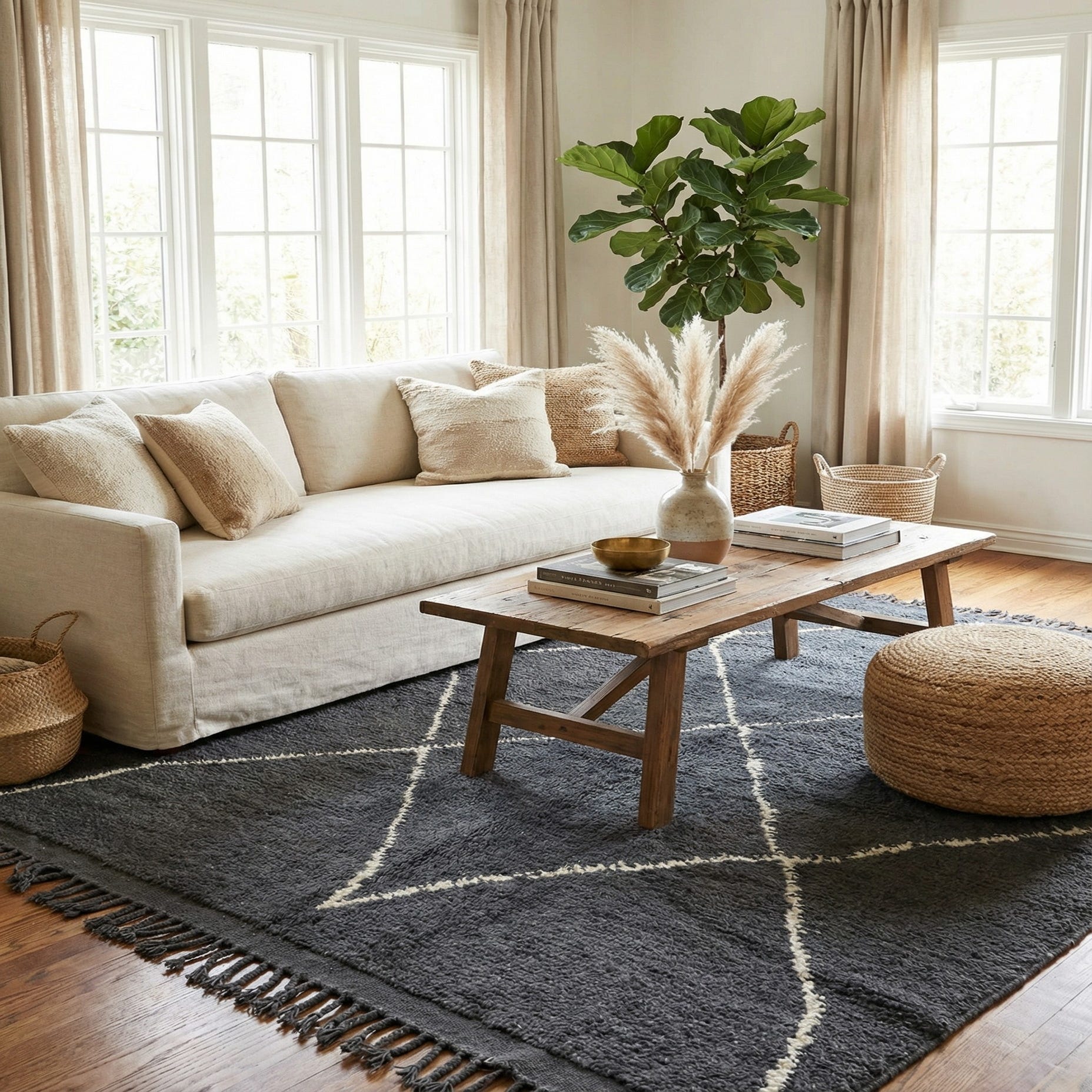 Primary color is Black. Colors in this rug include: Black, Ivory.