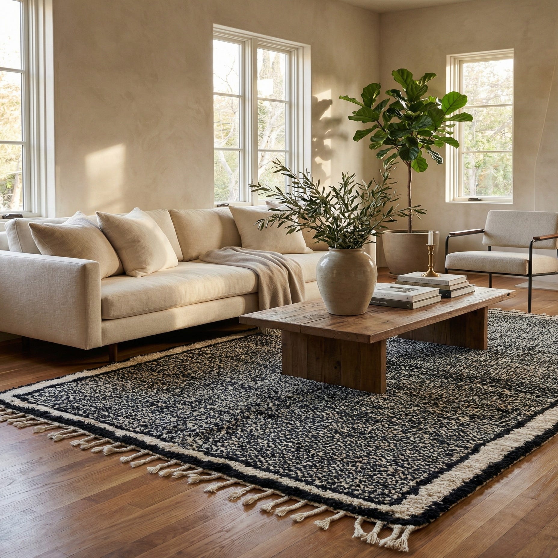 Primary color is Black. Colors in this rug include: Black, Ivory.