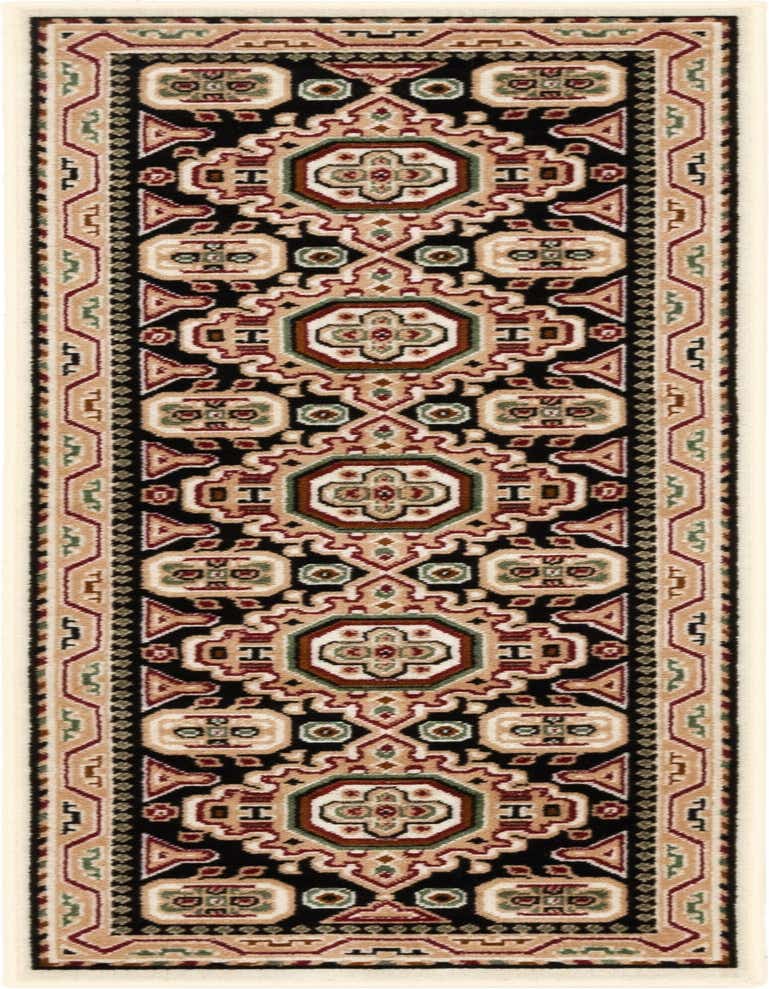 Primary color is Black. Colors in this rug include: Black, Beige, Green, Ivory, Orange, Red.