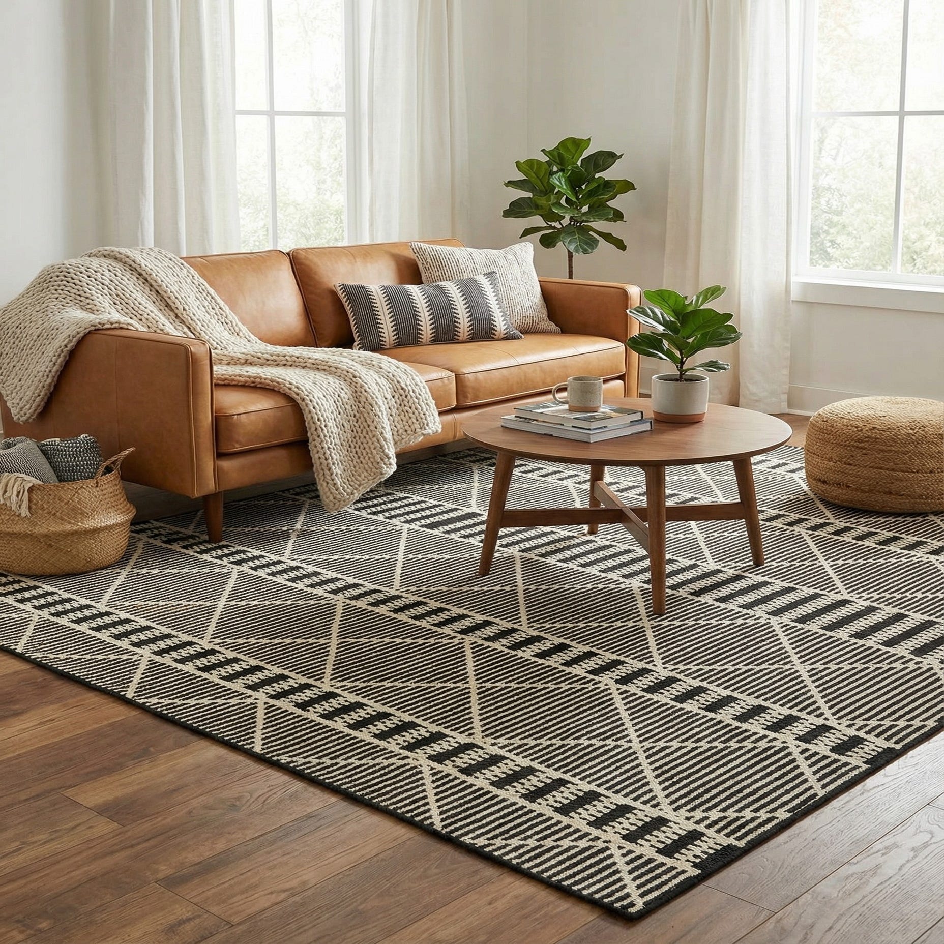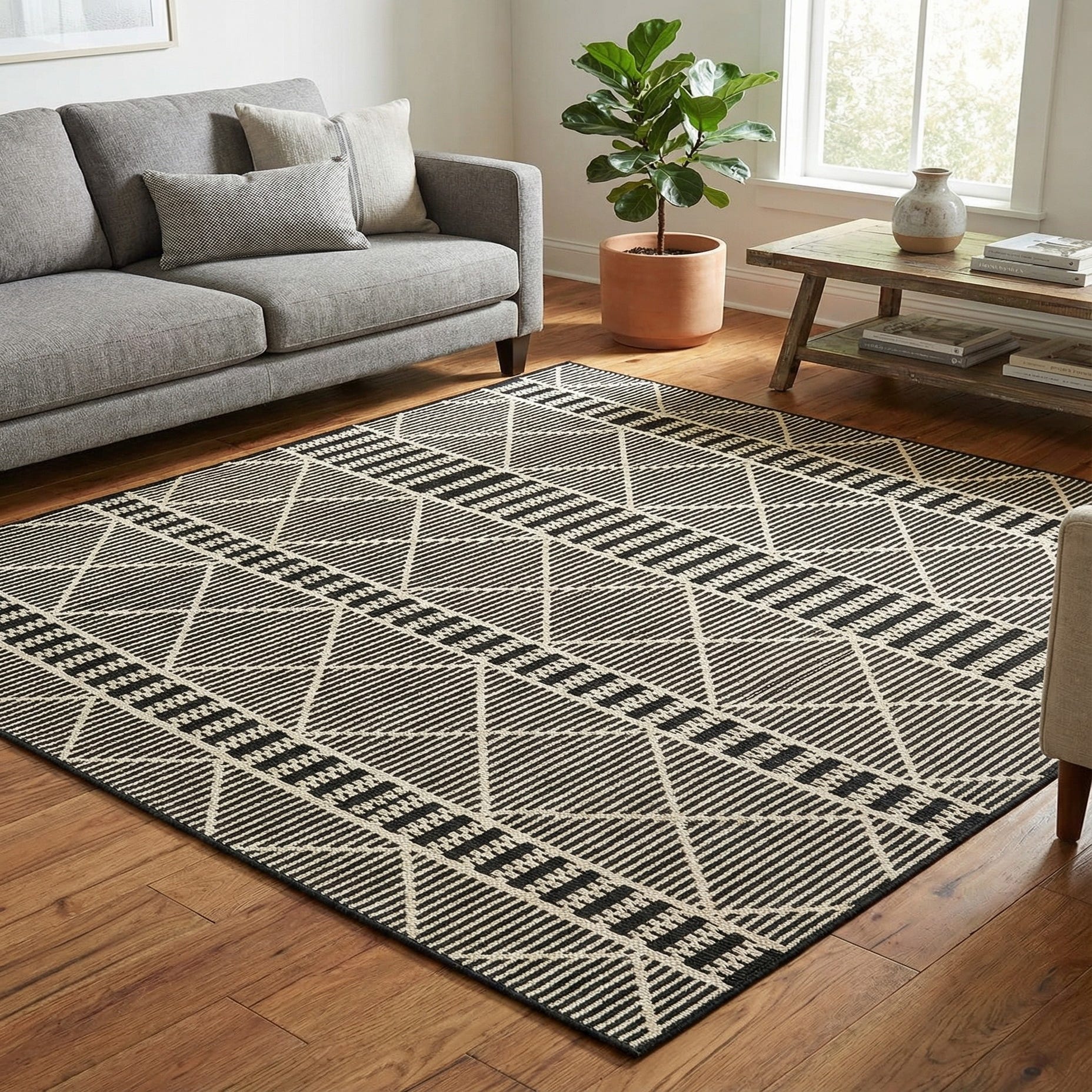 Primary color is Black. Colors in this rug include: Black, Ivory.