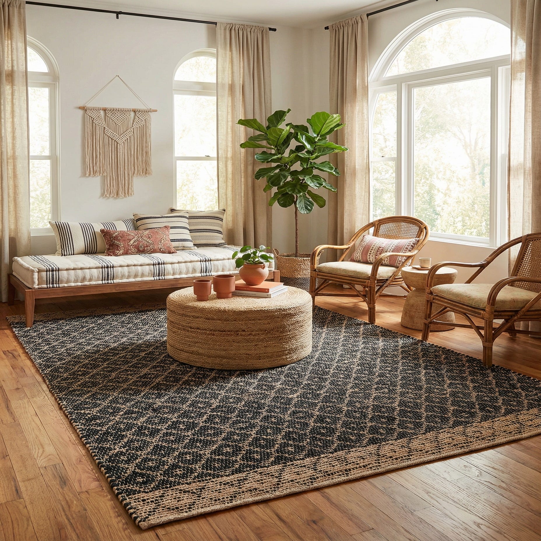 Primary color is Black. Colors in this rug include: Black, Natural.