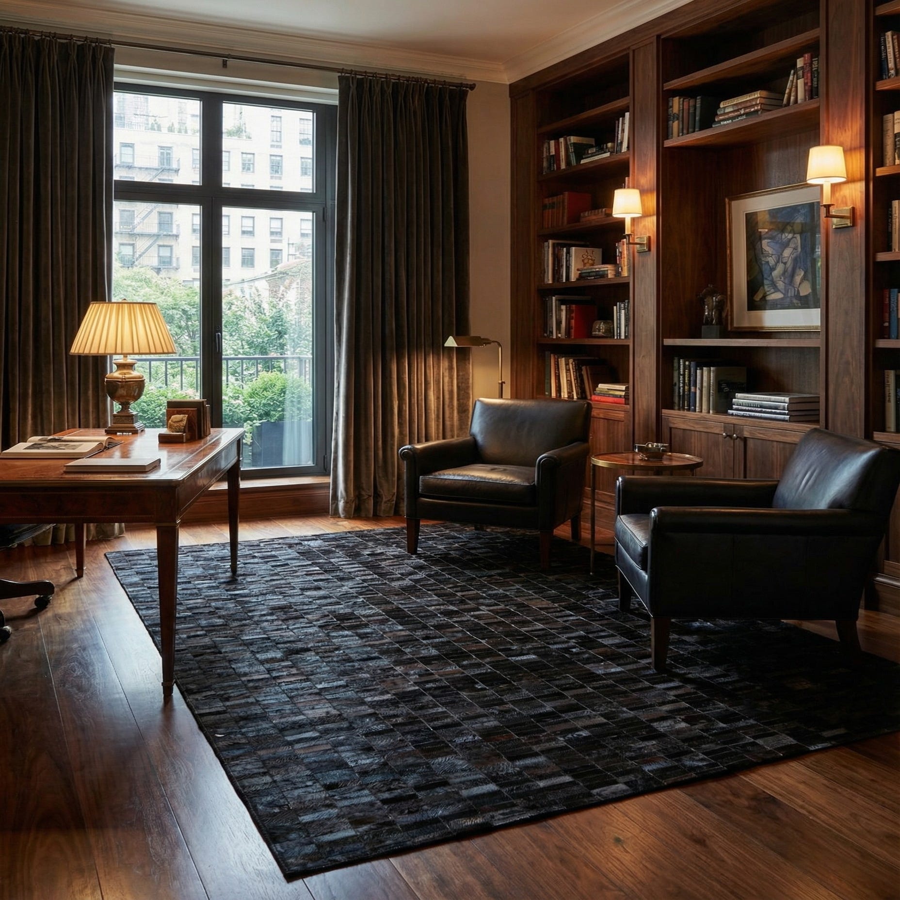 Primary color is Black. Colors in this rug include: Black, Brown.